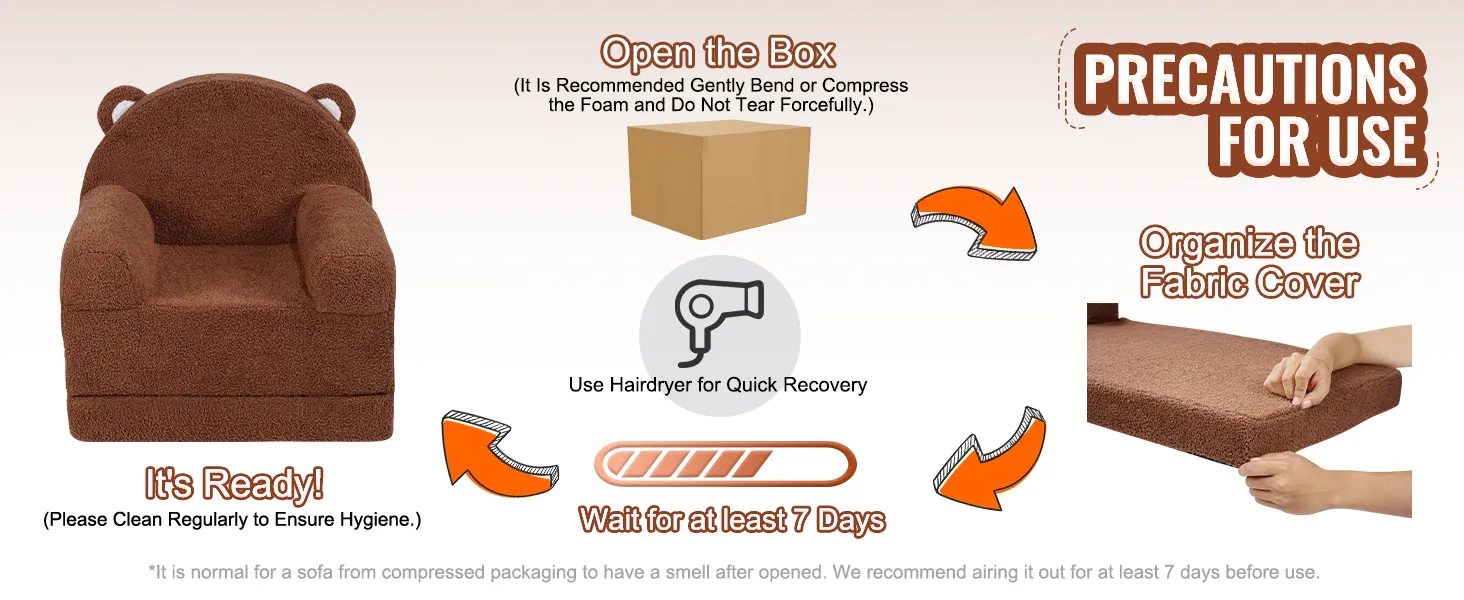 • Складная конструкция: Детский диван складной конструкции повышает удобство использования. В сложенном виде он служит самостоятельным креслом для чтения или отдыха; в разложенном виде превращается в кресло для сна или игровой коврик - одно кресло для многократного использования.