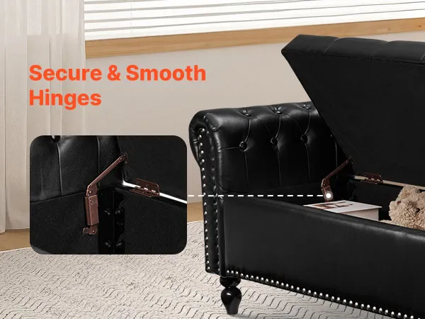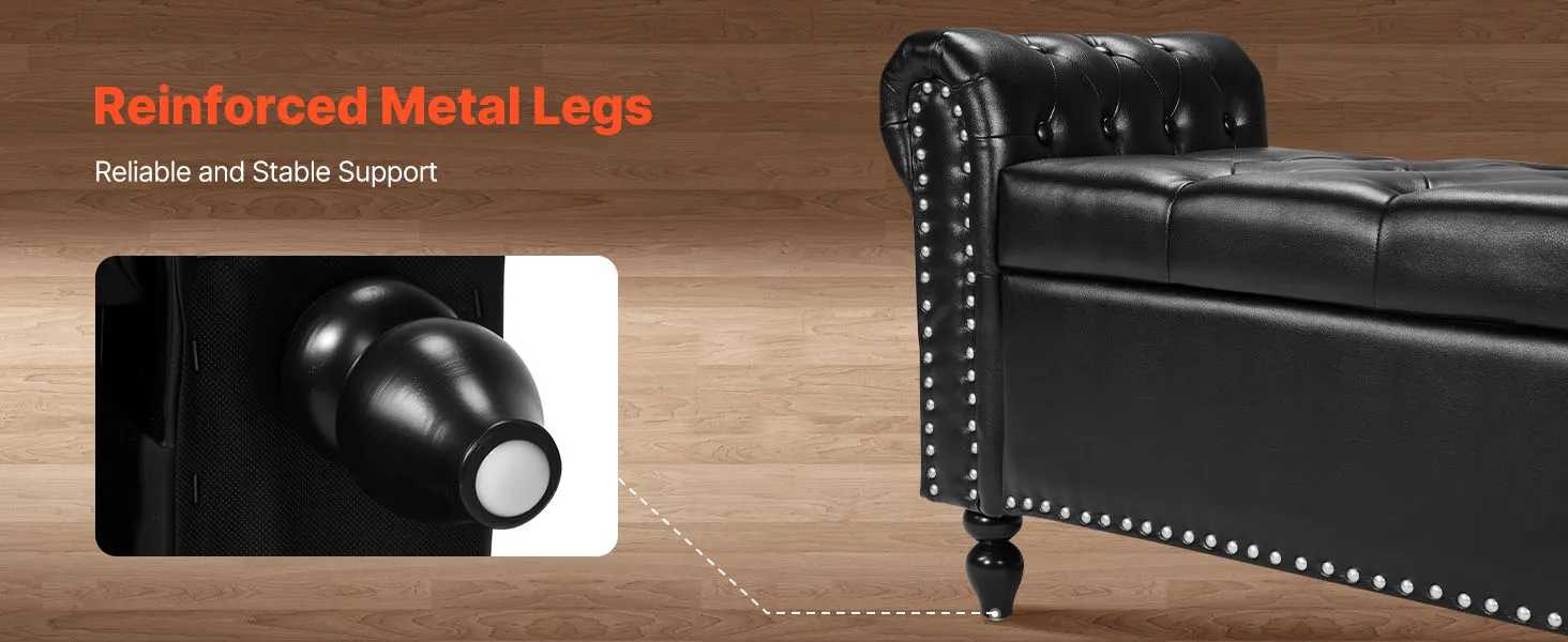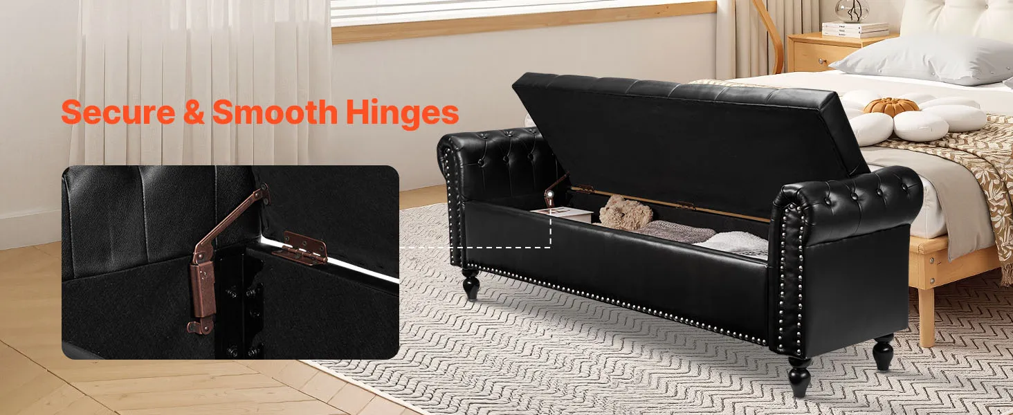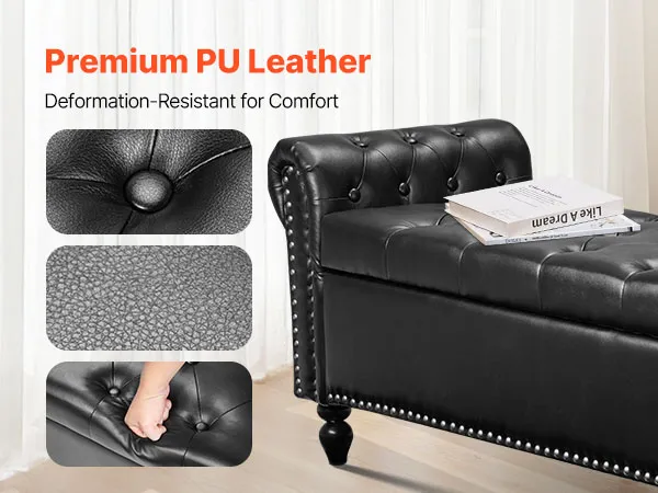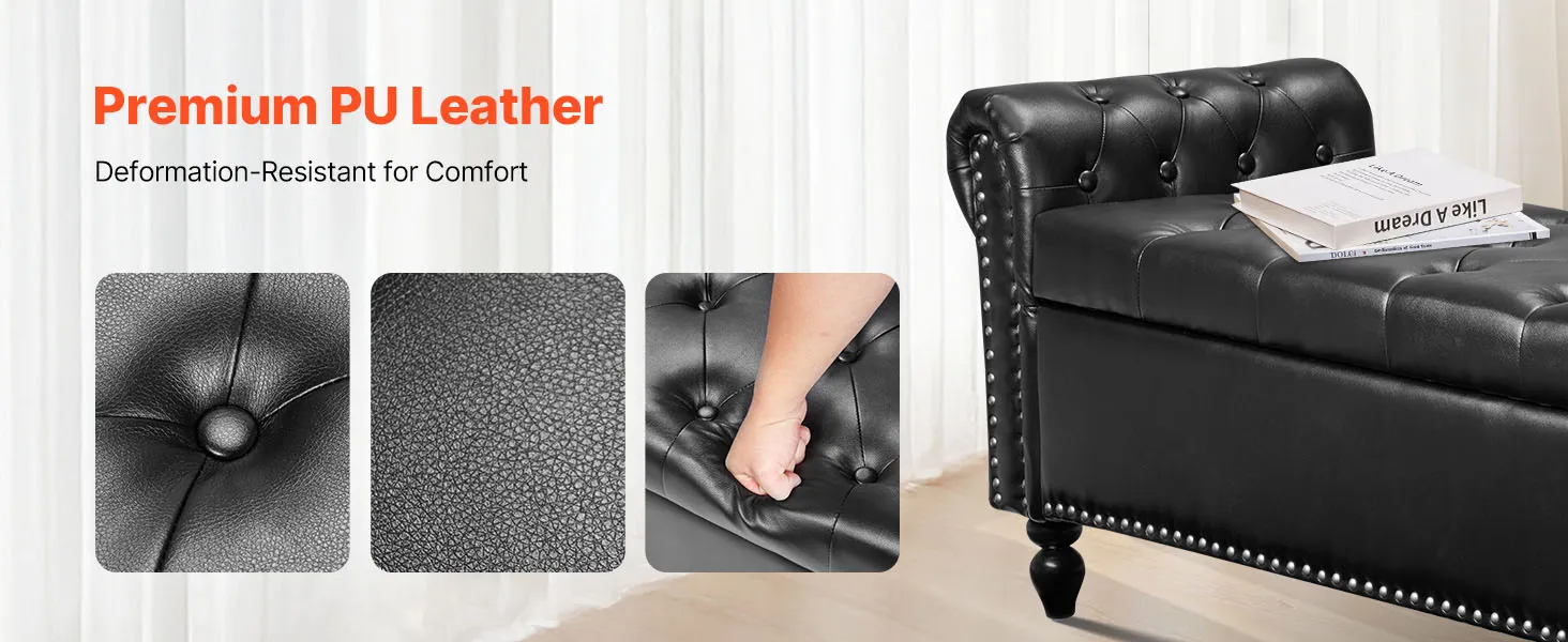 This PU leather bedroom bench features a hidden storage compartment, reliable weight capacity, and plush comfort—bringing both beauty and practicality together for a more organized and stylish bedroom.