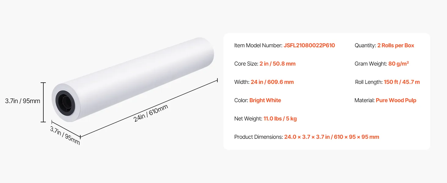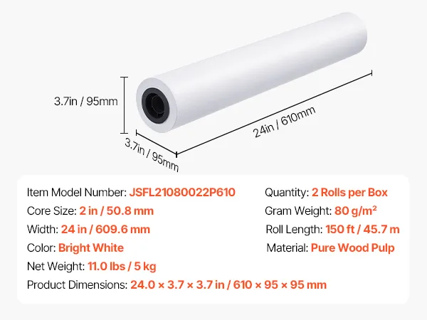 This box of wide format paper includes two rolls, each 24 inches wide and 150 feet long, precisely measured at 80 g/m² for consistent, high-quality results. The 2-inch core fits most standard plotter printers.