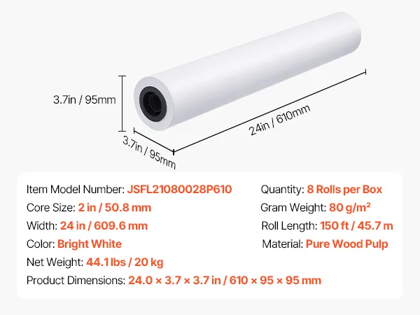 This box of wide format paper includes 8 rolls, each 24 inches wide and 150 feet long, precisely measured at 80 g/m² for consistent, high-quality results. The 2-inch core fits most standard plotter printers.