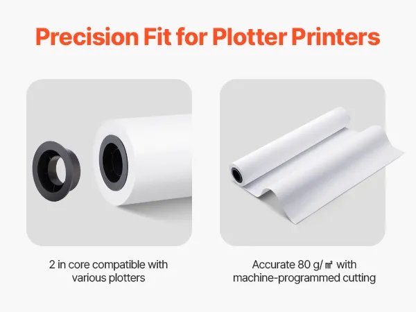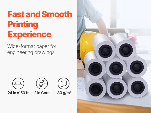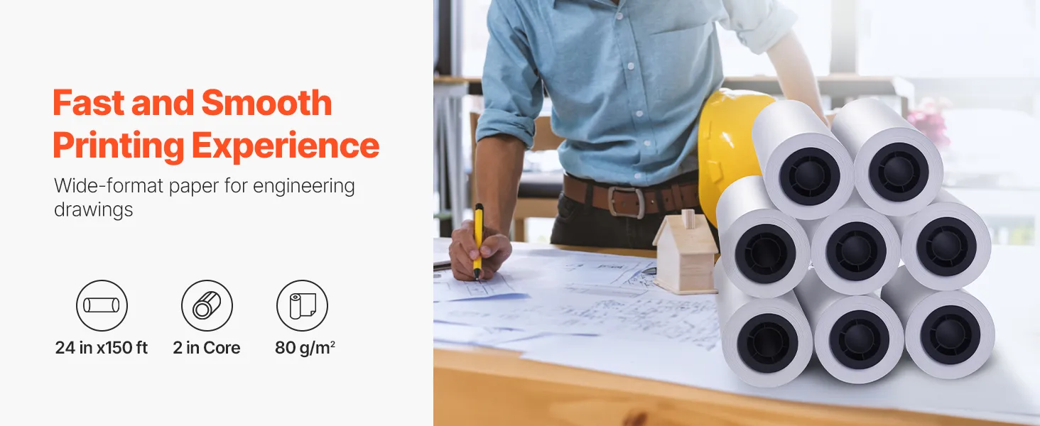 VEVOR Wide Format Paper, 609.6 mm x 45.7 m Plotter Roll, 8 Rolls CAD Bond Rolls with 50.8 mm Core, 80 GSM Plotter Roll Rolls, for CAD Drawings, Engineering Plans, GIS Maps, and Architectural Designs