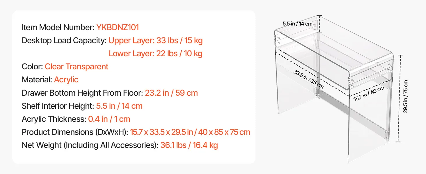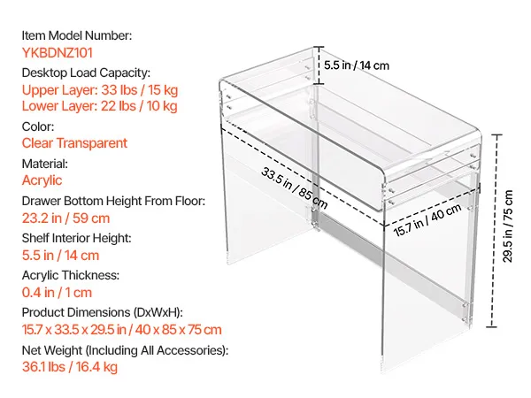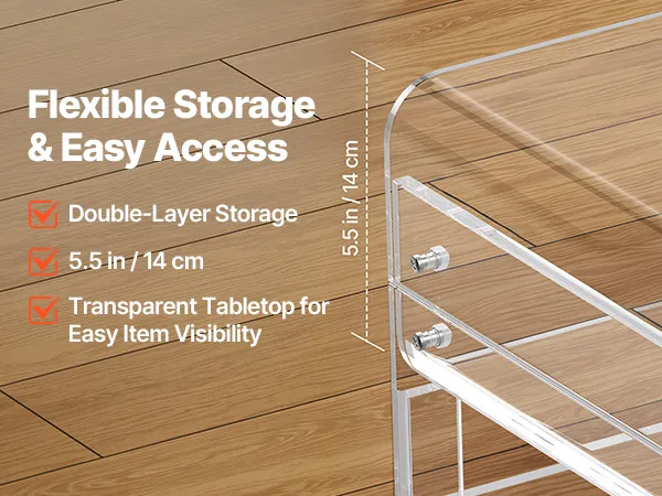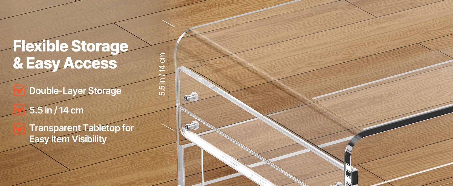 VEVOR Acrylic Table, 2 Tiers Clear End Table with Storage Shelf, Modern Rectangle Acrylic Side Desk, Transparent Thick Desk Nightstand for Bedroom, Office, Living Room, 40 x 85 x 75 cm (Clear)