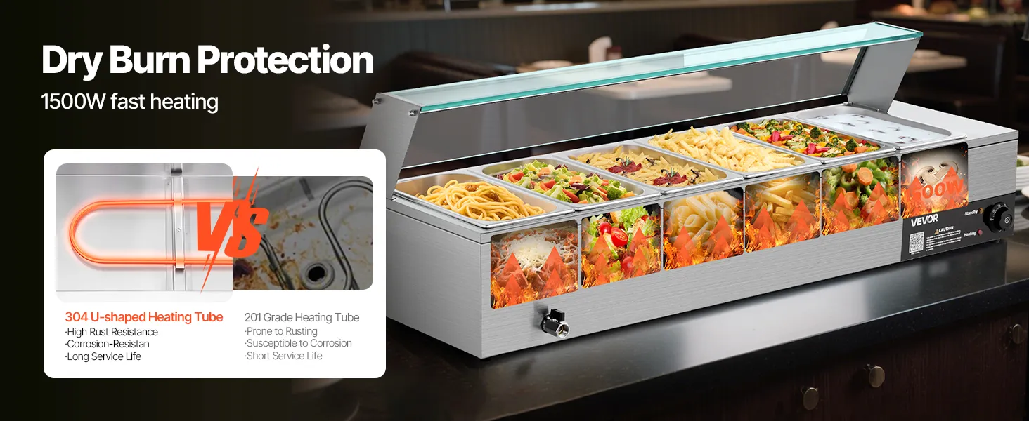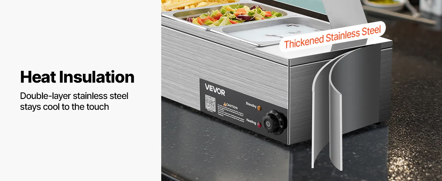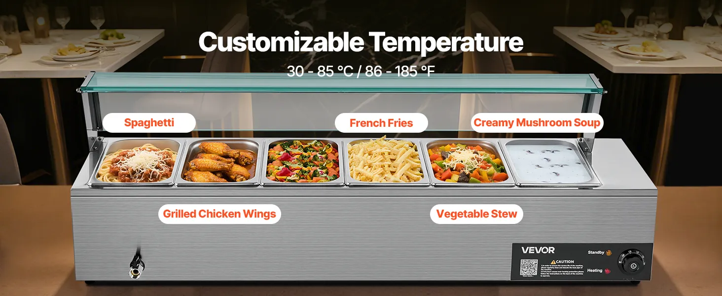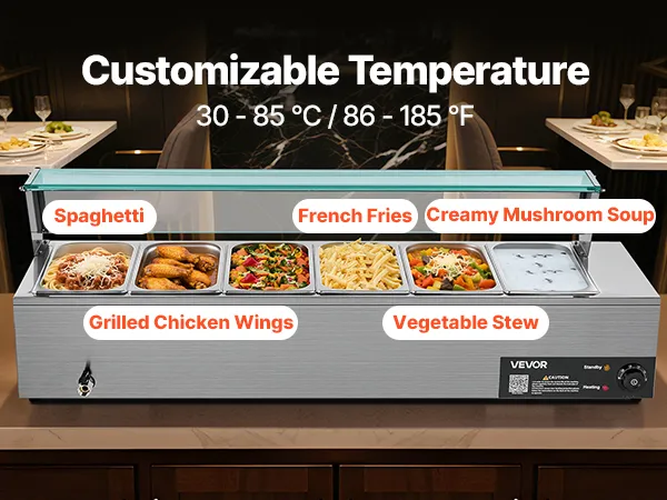 Made of stainless steel for durability and easy cleaning, this food warming features a wide U-shaped heating tube, adjustable temperature (30-85°C / 86-185°F), and a large chamber ideal for hotels, buffets, snack bars, and outdoor parties.