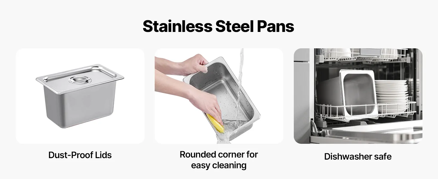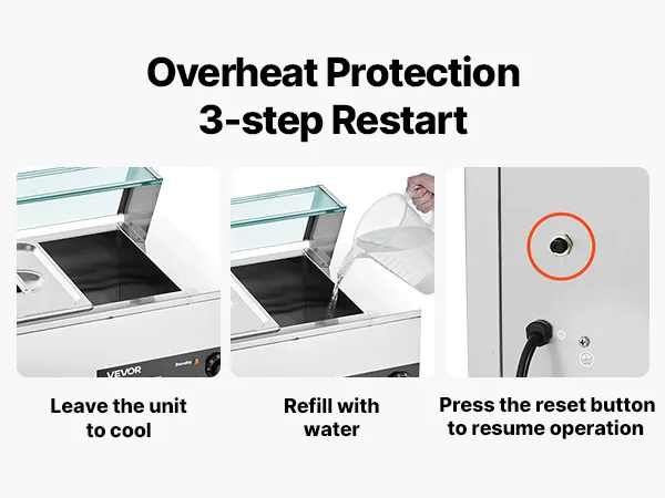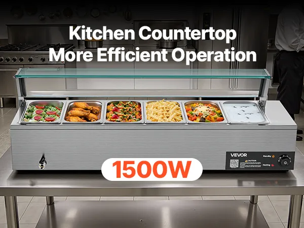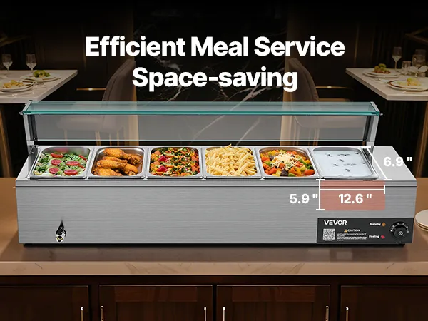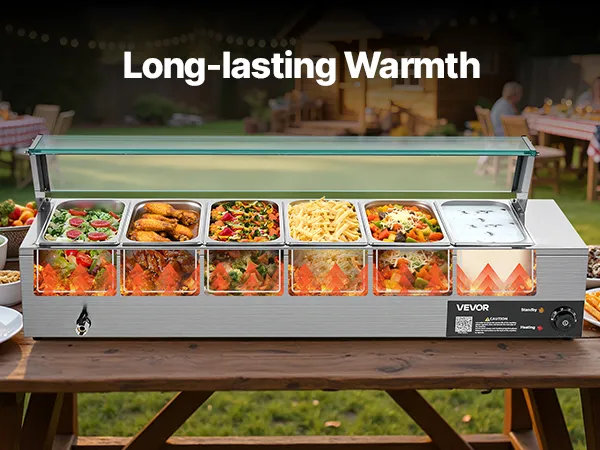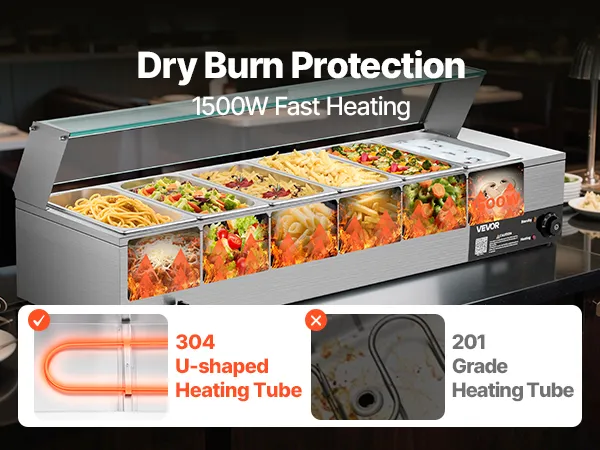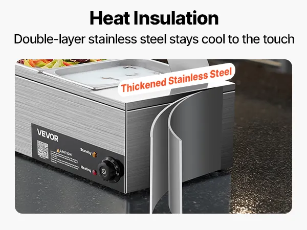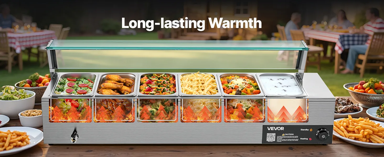 Made of stainless steel for durability and easy cleaning, this food warming features a wide U-shaped heating tube, adjustable temperature (30-85°C / 86-185°F), and a large chamber ideal for hotels, buffets, snack bars, and outdoor parties.