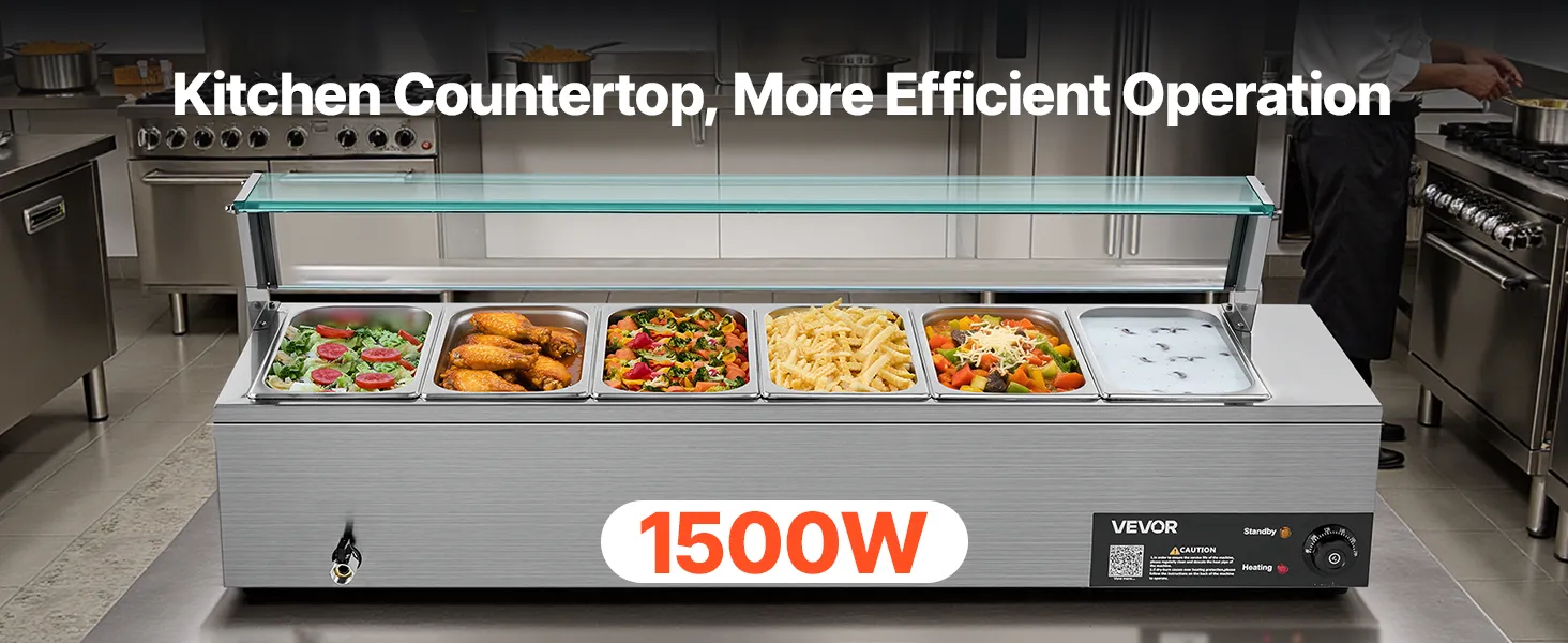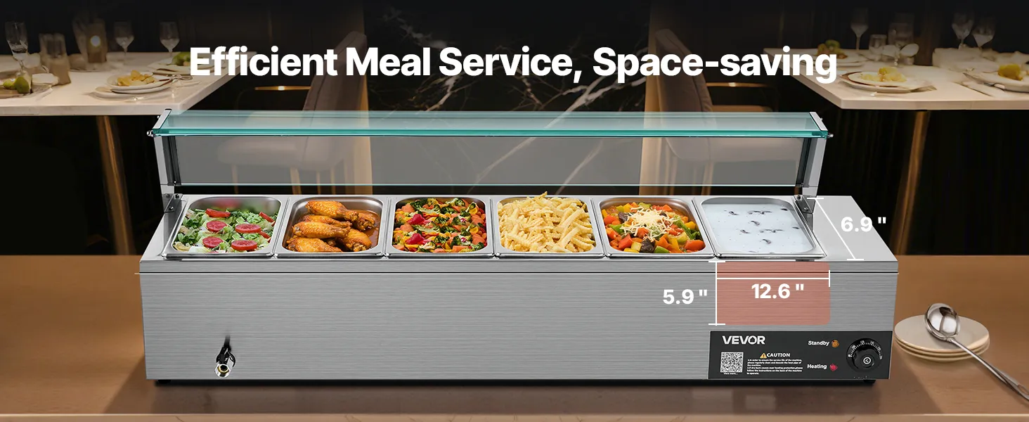 VEVOR Commercial Food Warmer, 1500W Electric Stainless Steel Steam Food Warmer with Glass Cover, 6 x 1/3 Size Pans Buffet Bain Marie with Soup & Perforated Ladles, for Catering, Restaurant & Party