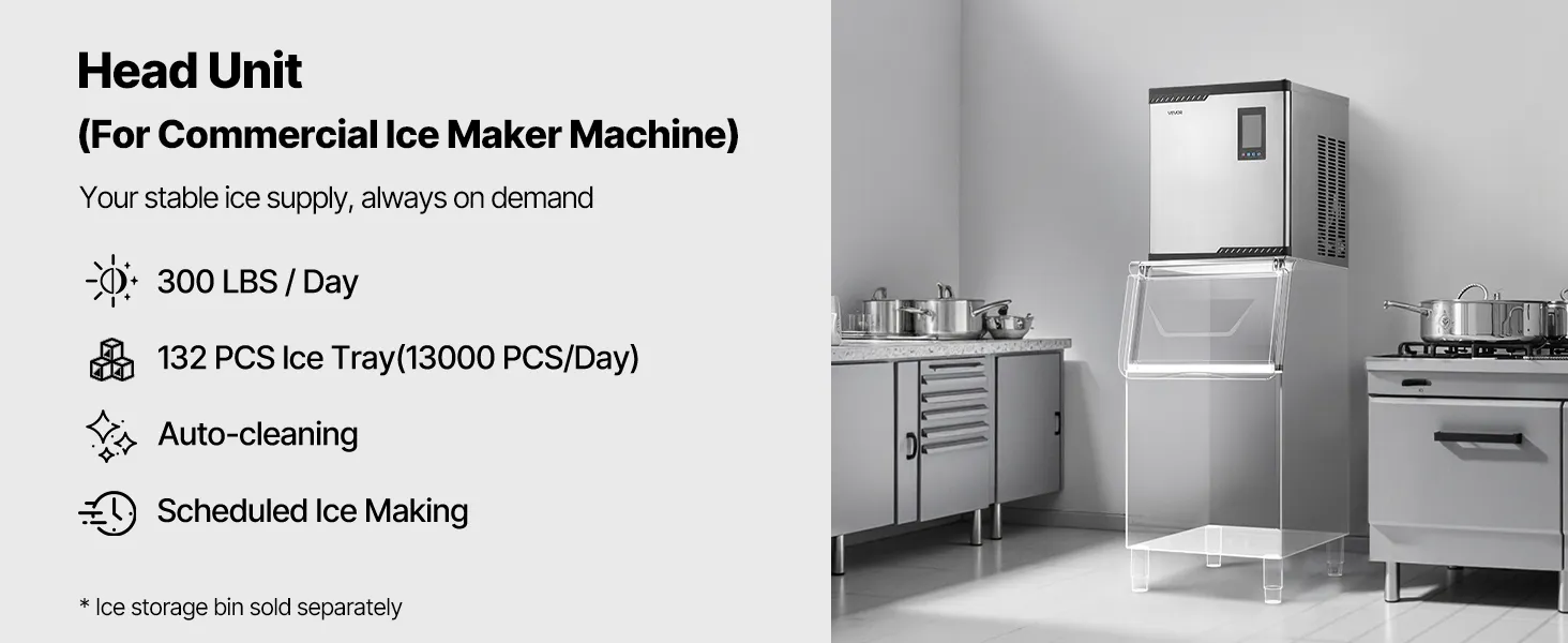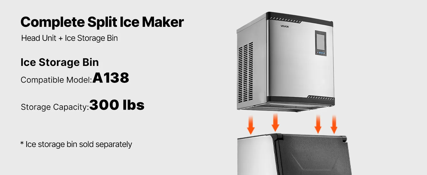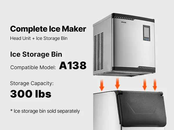 The head unit and ice bin combine to form a complete commercial ice maker. We provide a 300 lbs / 136 kg ice bin configuration, which is sold separately.