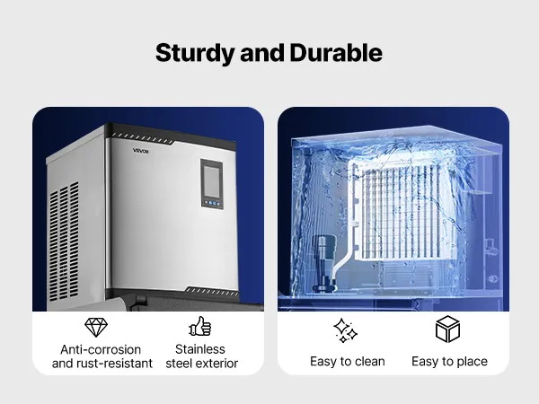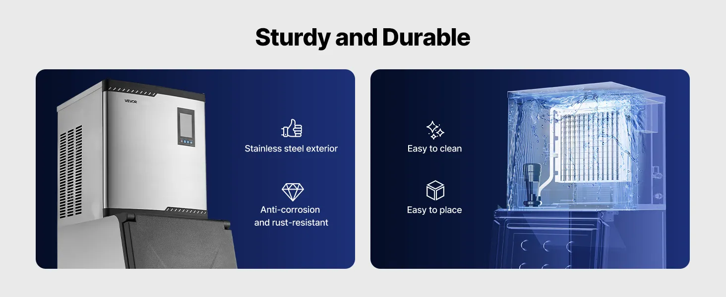 Коммерческий льдогенератор оснащен усовершенствованным корпусом из нержавеющей стали, который устойчив к ржавчине и коррозии, легко моется и отличается высокой прочностью.