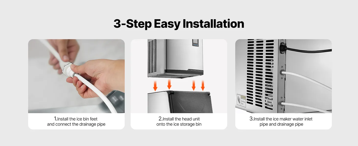 This commercial ice maker head delivers a continuous supply of ice, equipped with an intelligent control panel for simple operation and convenient scheduling. Its one-touch self-cleaning function ensures easy maintenance and hygienic ice production, making it ideal for restaurants, bars, hotels, cafés, and other commercial settings.
