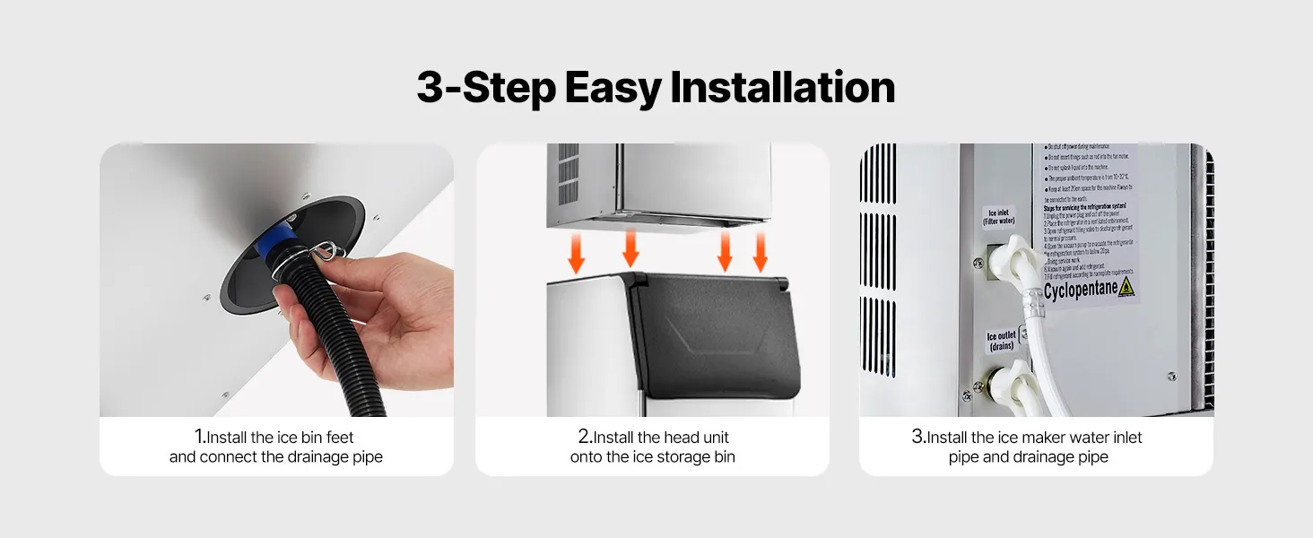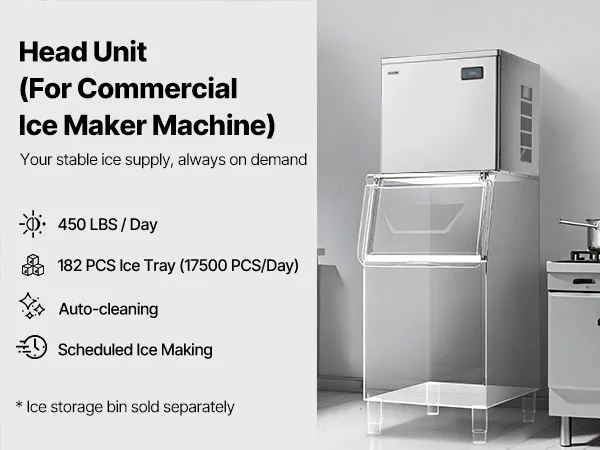 This commercial ice maker head delivers a continuous supply of ice, equipped with an intelligent control panel for simple operation and convenient scheduling. Its one-touch self-cleaning function ensures easy maintenance and hygienic ice production, making it ideal for restaurants, bars, hotels, cafés, and other commercial settings.