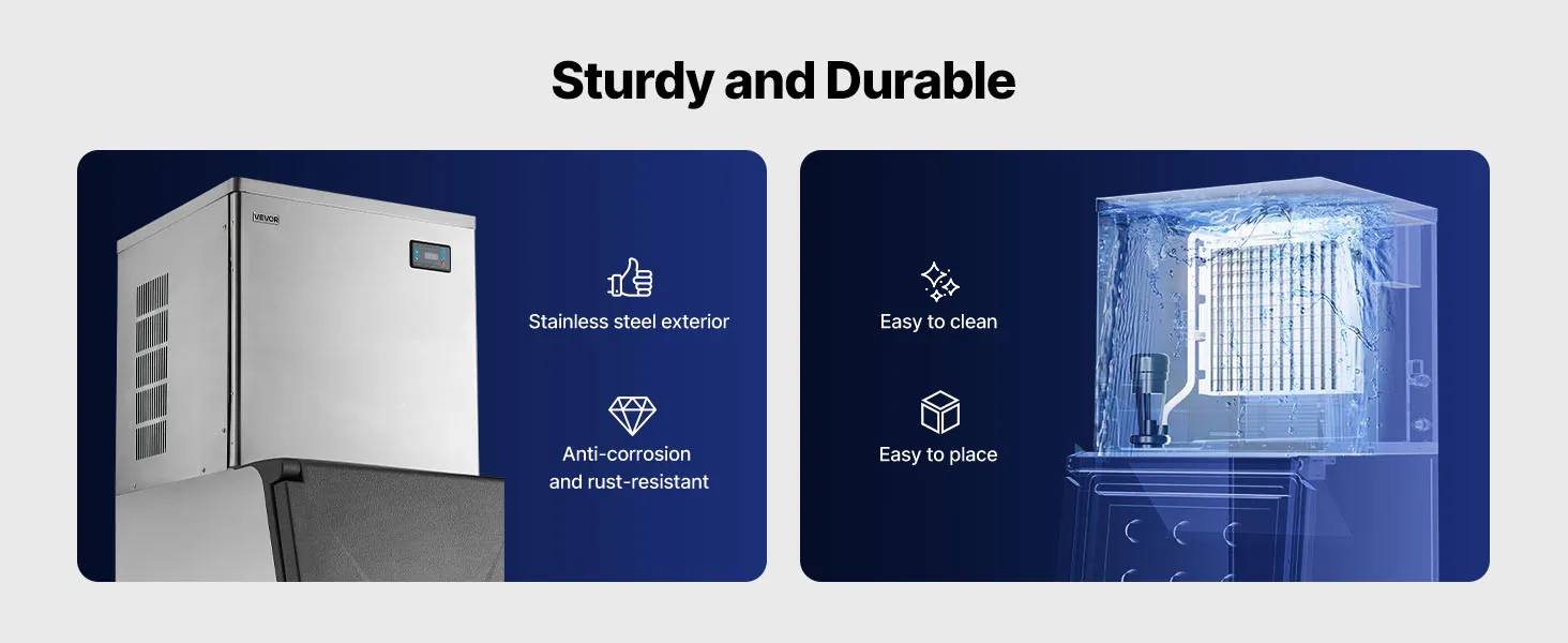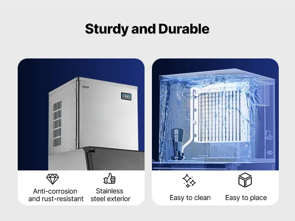 Коммерческий льдогенератор оснащен усовершенствованным корпусом из нержавеющей стали, который устойчив к ржавчине и коррозии, легко моется и отличается высокой прочностью.