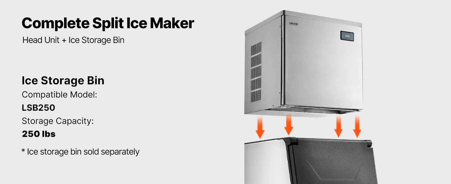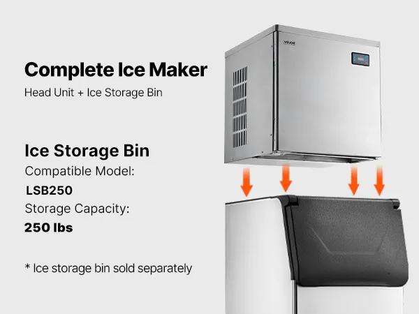 The head unit and ice bin combine to form a complete commercial ice maker. We provide a 250 lbs / 113 kg ice bin configuration, which is sold separately.
