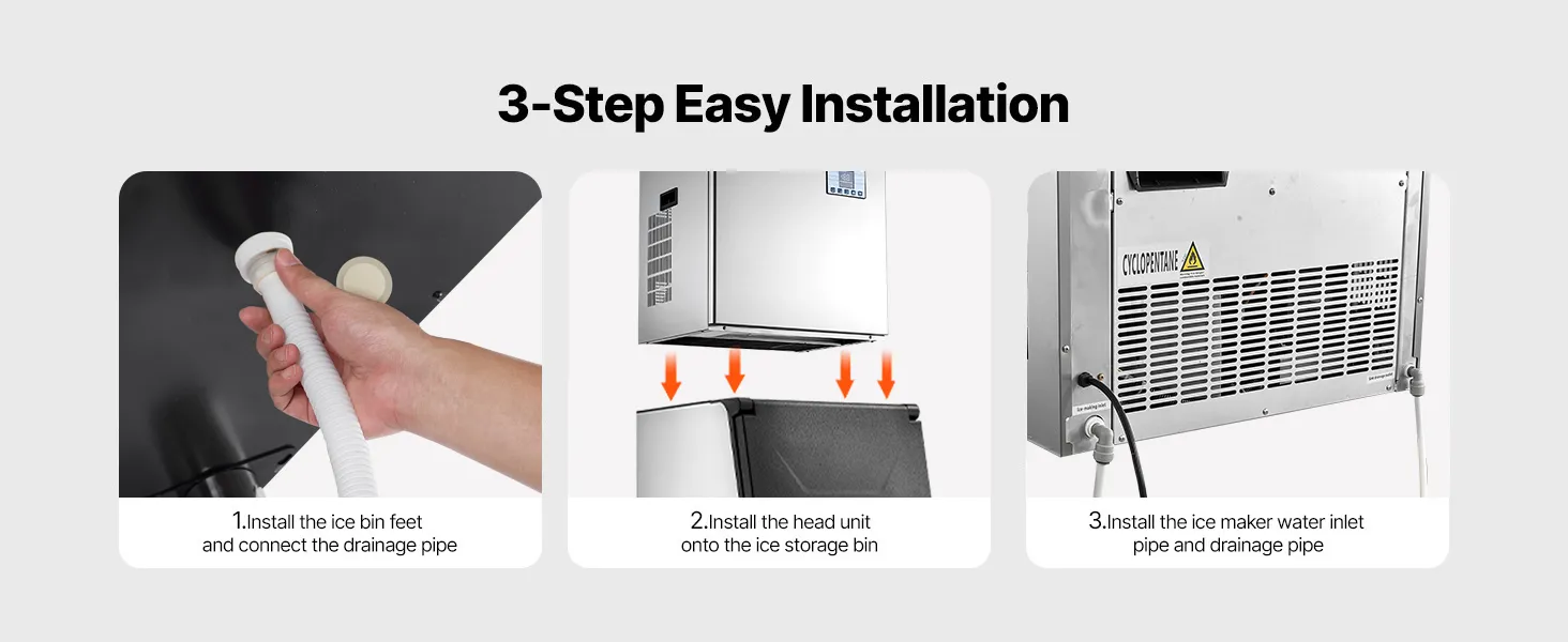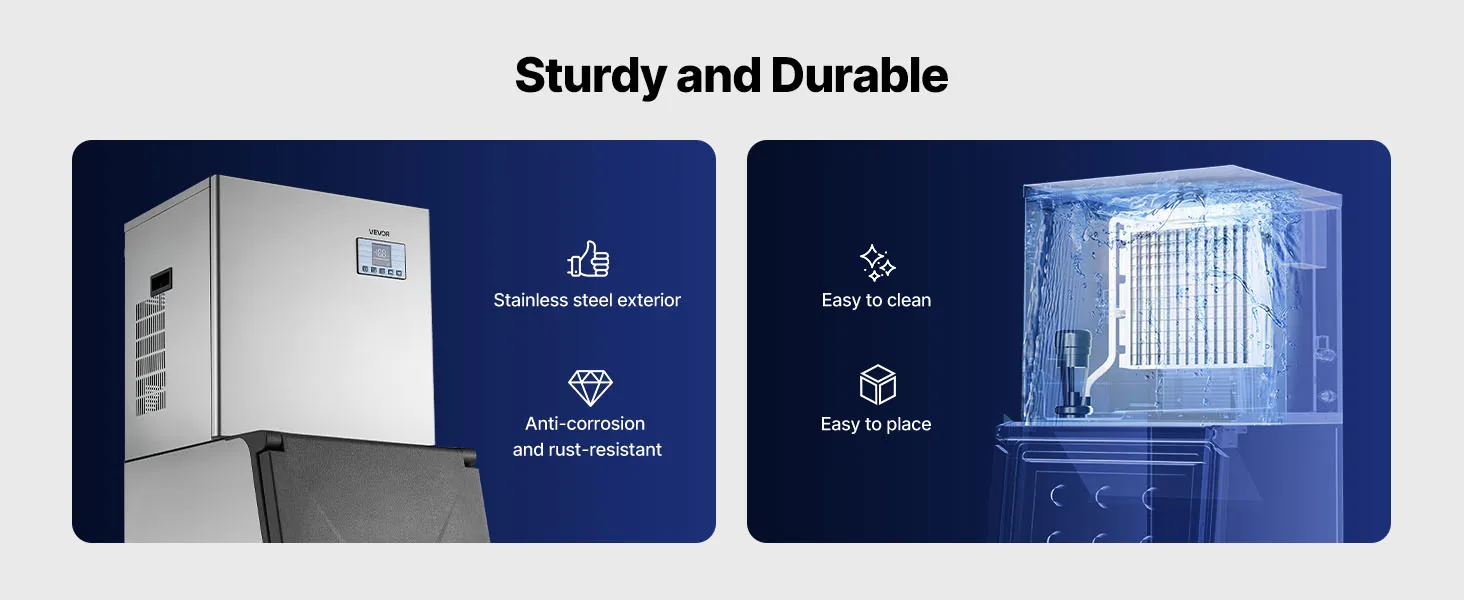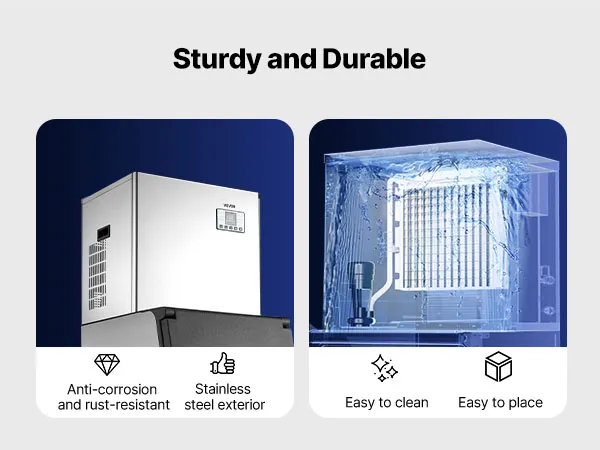 Коммерческий льдогенератор оснащен усовершенствованным корпусом из нержавеющей стали, который устойчив к ржавчине и коррозии, легко моется и отличается высокой прочностью.