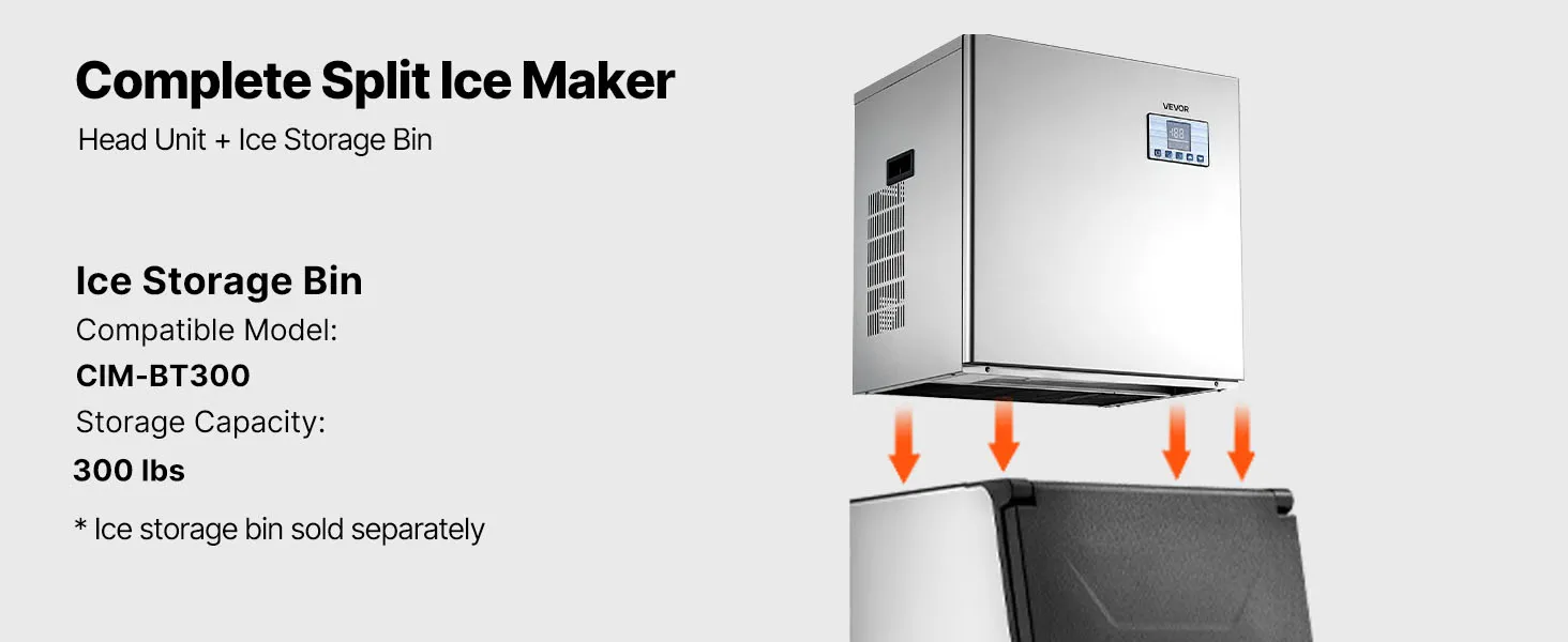 The head unit and ice bin combine to form a complete commercial ice maker. We provide a 300 lbs / 136 kg ice bin configuration, which is sold separately.