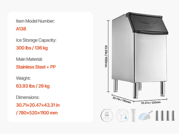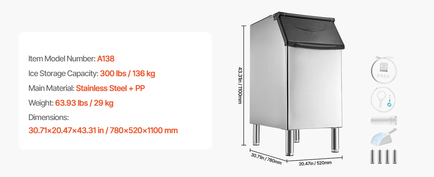VEVOR Commercial Ice Maker Storage Bin, 136 KG Capacity Ice-Bin, Stainless Steel Commercial Ice Storage Bin with Adjustable Anti-slip Rubber Feet, Suitable for Restaurant Hotel and Beverage Shops