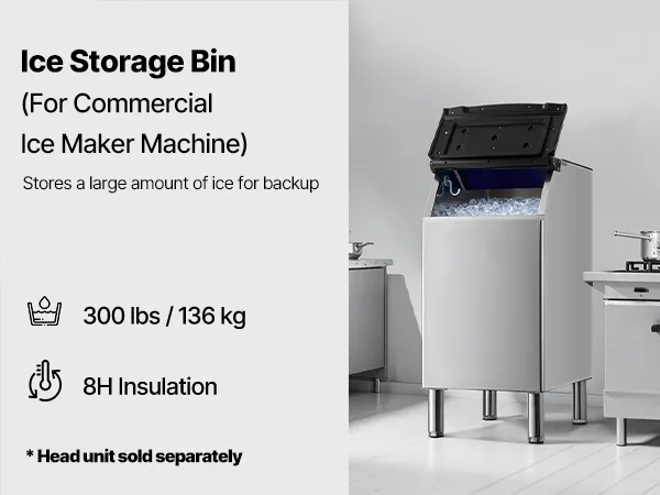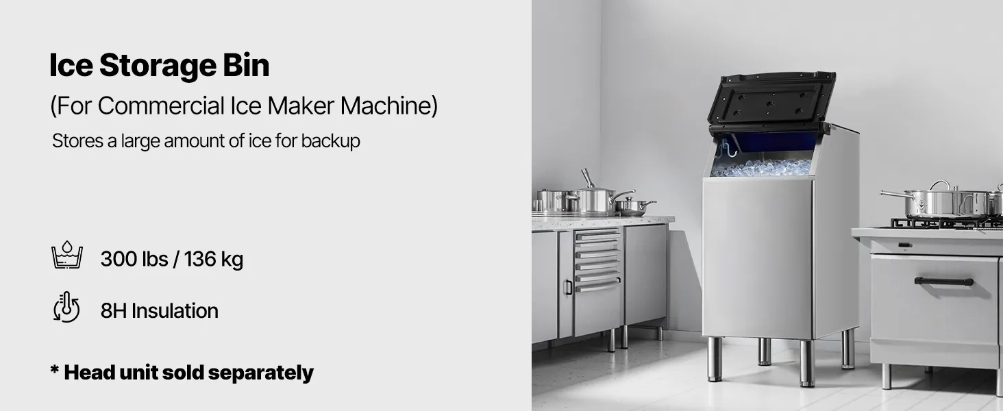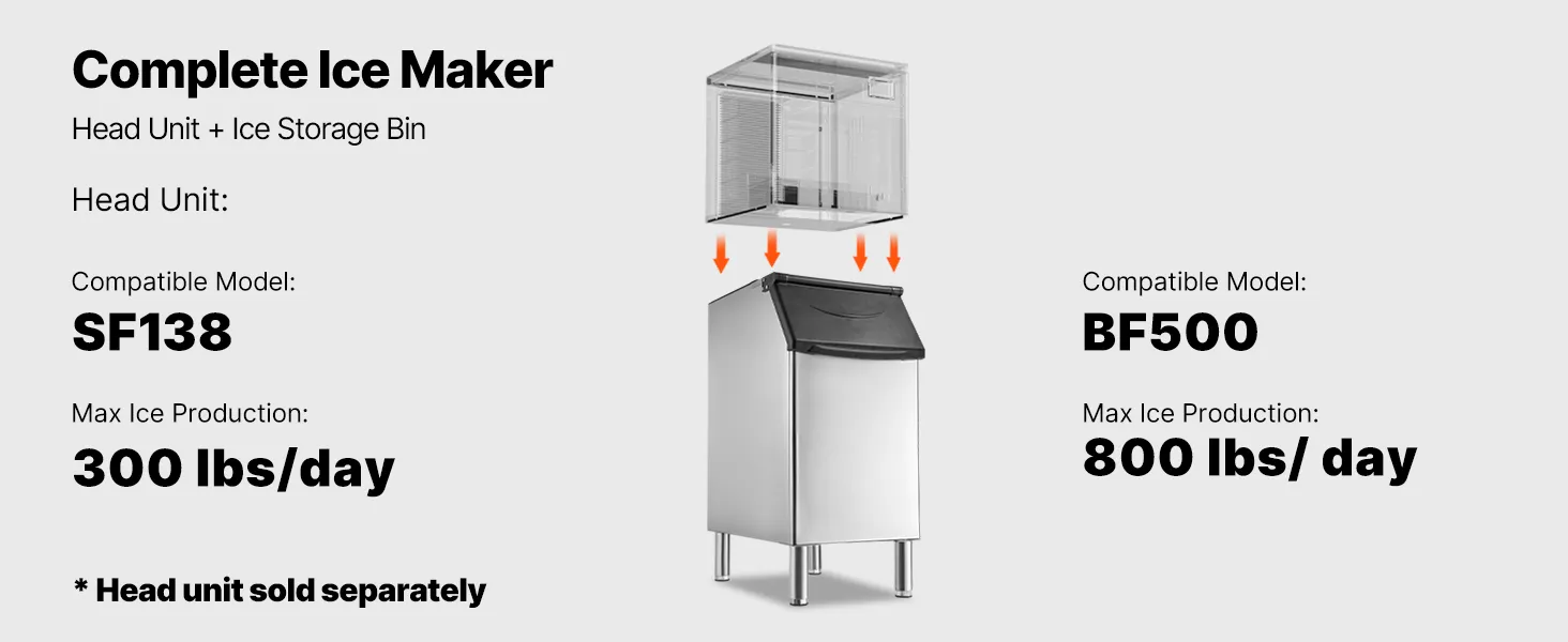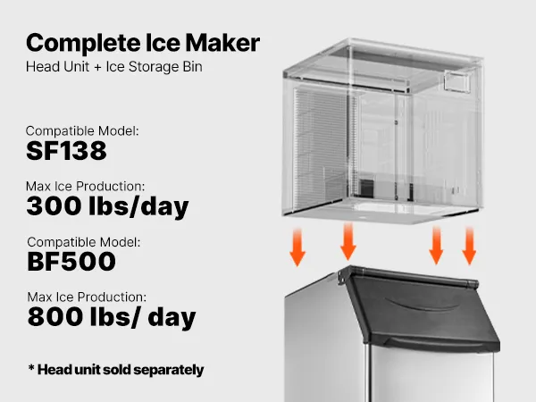 The head unit and ice bin combine to form a complete commercial ice maker. We provide a 300 lbs ice bin configuration, which is sold separately.