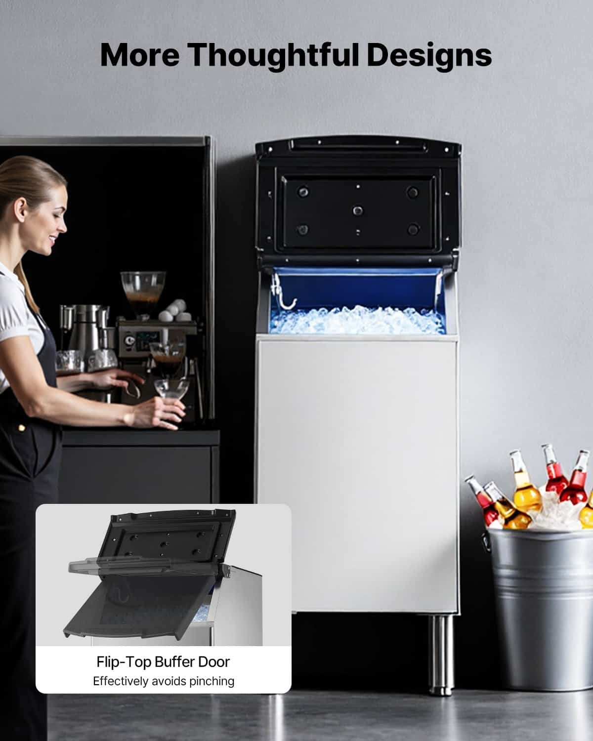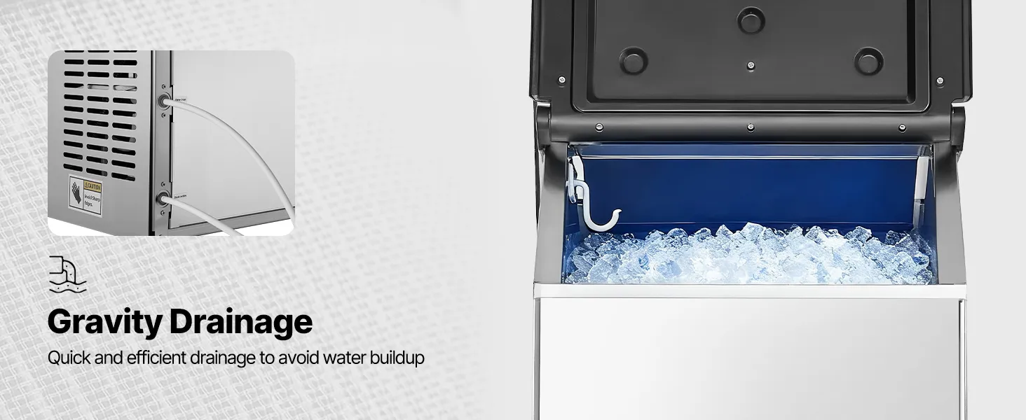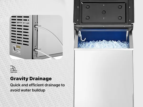 Бункер для хранения льда оснащен функцией автоматического слива, которая обеспечивает эффективный слив воды, предотвращает накопление воды и обеспечивает чистую и здоровую среду для производства льда.