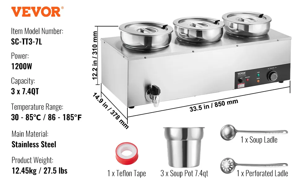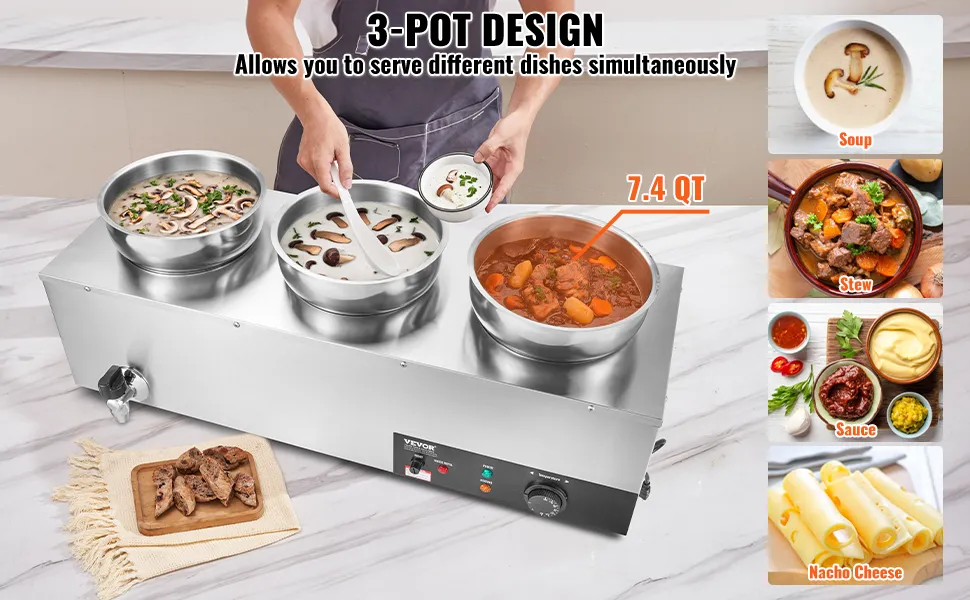 • Включает в себя три кастрюли для супа объемом 7,4 куб. м.: Наша коммерческая грелка для супа оснащена тремя круглыми кастрюлями объемом 7,4 куб. м. с соответствующими крышками, что позволяет подавать разные блюда одновременно. Смело меняйте свое меню с супов и соусов на тушеное мясо или даже на сыр начо с шоколадом.