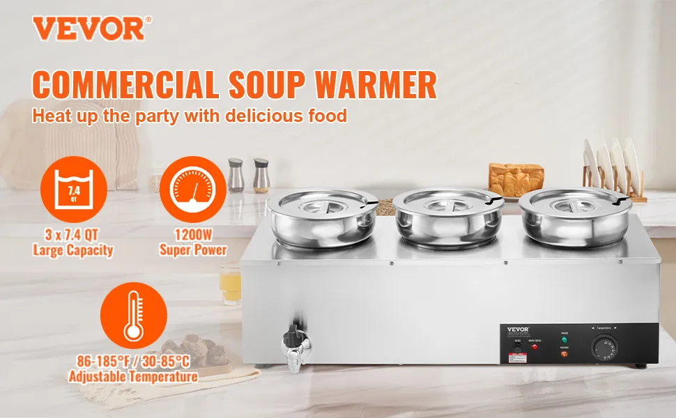 VEVOR Коммерческий Подогреватель Супа с 3x7Л Кастрюлями, 1200Вт Нерж. Сталь, Контроль Температуры и Защита