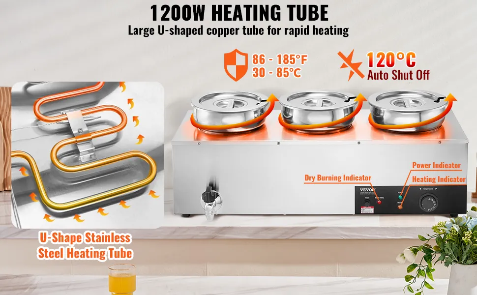 • Быстрый нагрев, длительное тепло: Эта впечатляющая грелка для приготовления пищи оснащена мощной нагревательной трубкой из нержавеющей стали мощностью 1200 Вт, которая быстро разогревает пищу, сохраняя ее горячий и восхитительный вкус. Вы можете регулировать выходную температуру в соответствии с вашими предпочтениями, начиная с 86 – 185℉ / 30 – 85℃, благодаря регулятору температуры.
