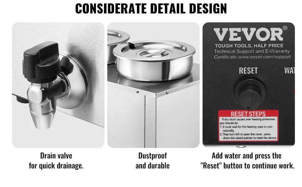 • Дополнительная безопасность: Мы модернизировали нашу подогревательницу для продуктов, оснастив ее новым ”Индикатором сухого горения“ и "Кнопкой сброса”. Функция индикатора пригорания автоматически прекращает разогрев продуктов, когда температура превышает 248 ° F (120 ° C). Чтобы возобновить работу, просто долейте воды и нажмите кнопку сброса.