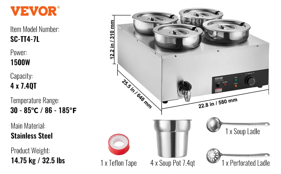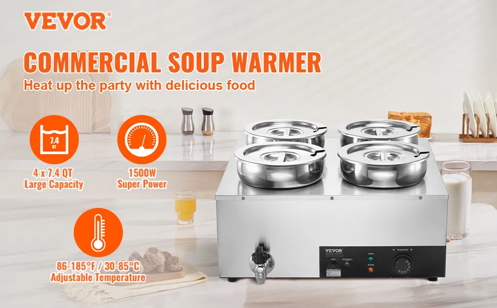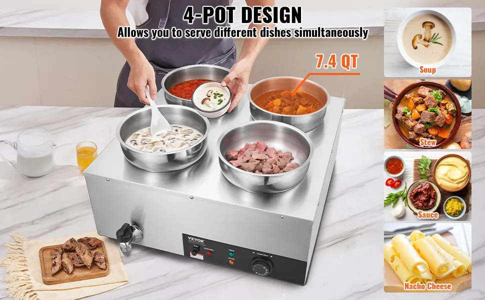 • Включает в себя четыре кастрюли для супа объемом 7,4 куб. м.: Наша коммерческая разогревалка для супа оснащена четырьмя круглыми кастрюлями объемом 7,4 куб. м. с соответствующими крышками, что позволяет подавать разные блюда одновременно. Смело меняйте свое меню с супов и соусов на тушеное мясо или даже на сыр начо с шоколадом.
