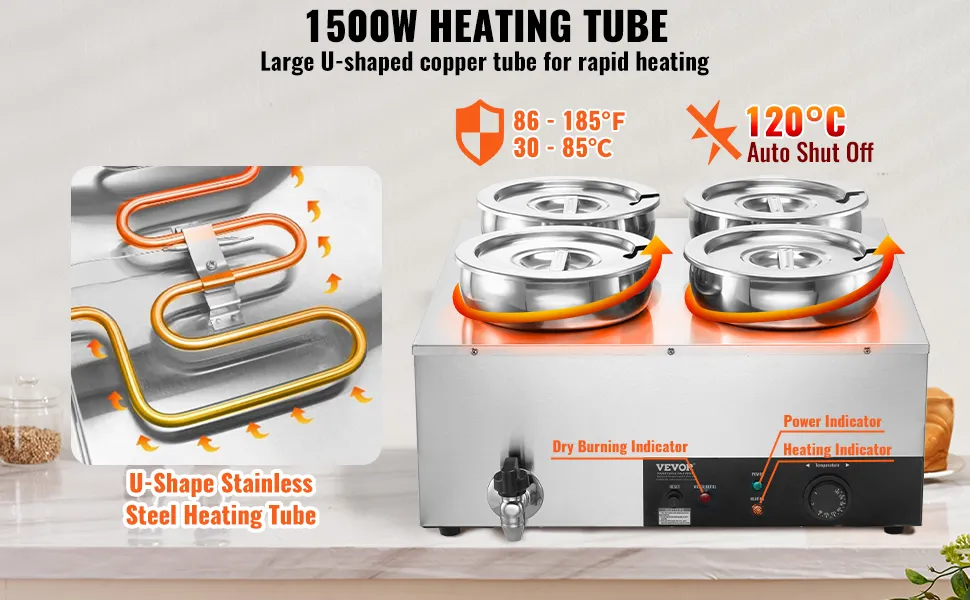 • Быстрый нагрев, длительное тепло: Эта впечатляющая грелка для приготовления пищи оснащена мощной нагревательной трубкой из нержавеющей стали мощностью 1500 Вт, которая быстро разогревает пищу, сохраняя ее горячий и восхитительный вкус. Вы можете регулировать выходную температуру в соответствии с вашими предпочтениями, начиная с 86 – 185℉ / 30 – 85℃, благодаря регулятору температуры.