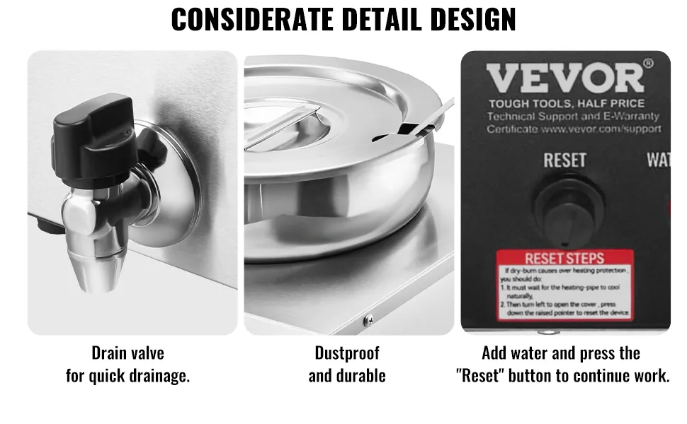 • Дополнительная безопасность: Мы модернизировали нашу подогревательницу для продуктов, оснастив ее новым ”Индикатором сухого горения“ и "Кнопкой сброса”. Функция индикатора пригорания автоматически прекращает разогрев продуктов, когда температура превышает 248 ° F (120 ° C). Чтобы возобновить работу, просто долейте воды и нажмите кнопку сброса.