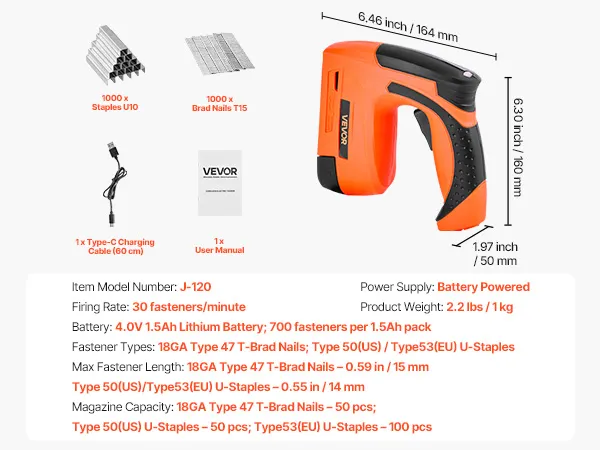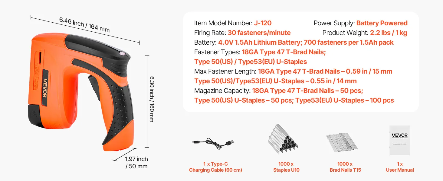 • Efficient Driving: Powered by an electric motor, the cordless staple gun delivers steady force and up to 30 nails/min. It rapidly sets nails and staples into wood and similar materials, maintaining steady power to avoid jams or bent fasteners