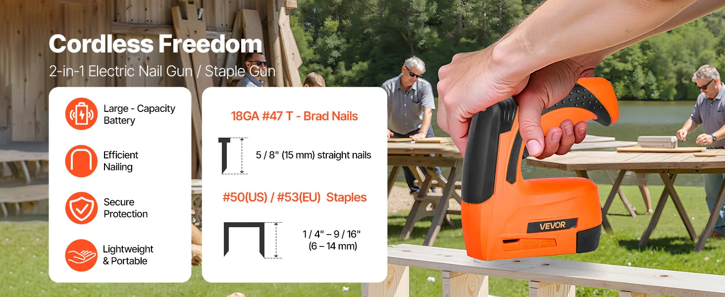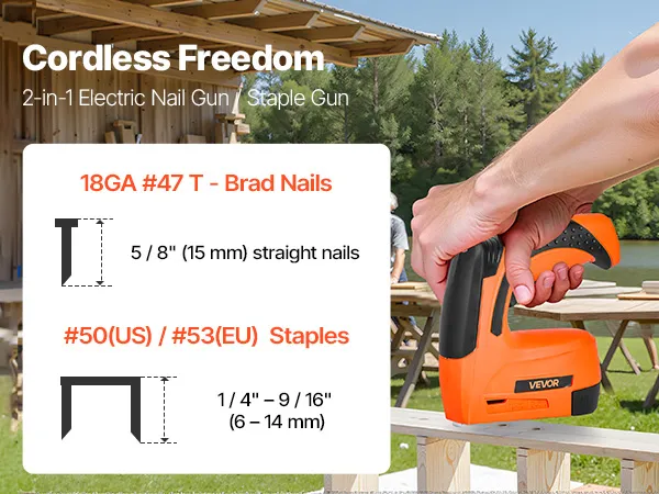VEVOR Беспроводной 2-в-1 Гвоздезабивной и Скобозабивной Пистолет, 18GA, 15 мм Гвозди, 6–14 мм Скобы, Аккумуляторный, 2000 Крепежей
