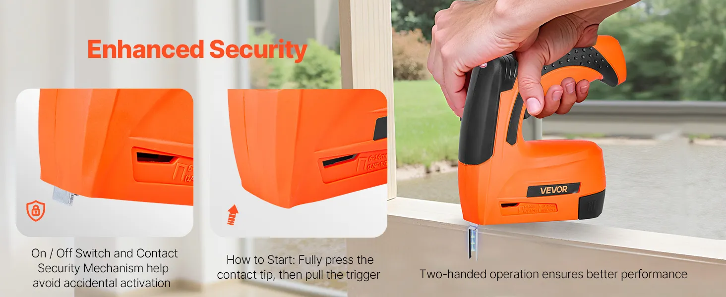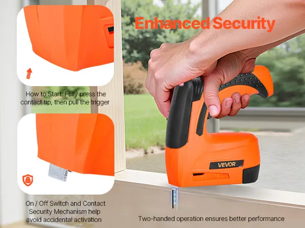 • Safeguards: This electric staple gun features a power switch, contact tip, and trigger lock to help avoid accidental firing. It operates only when pressed to the work surface, and the non-slip rubber handle helps limit fatigue during long tasks