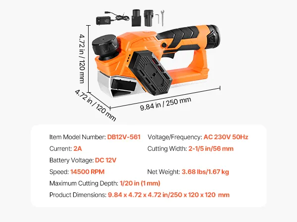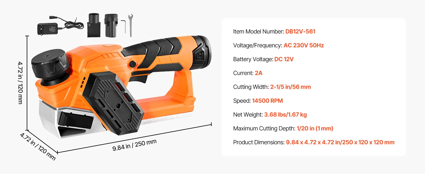 VEVOR Cordless Handheld Planer, 56 mm Cut Width, 14500 RPM Electric Hand Wood Planer with 2 Ah 12V Lithium Battery, Brushless Motor, Adjustable Cut Depth, 2 Blades, for Woodworking Wood Chamfer DIY