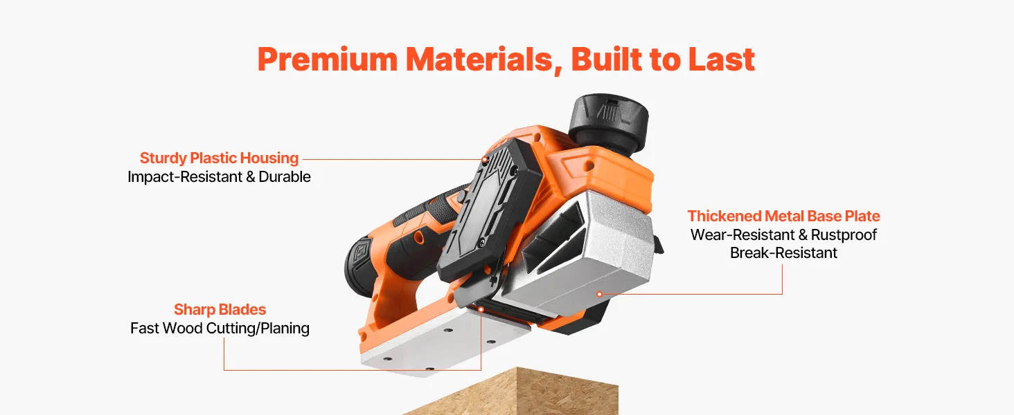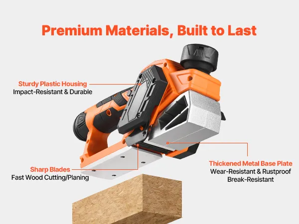 With a powerful motor, our electric hand planer delivers strong performance. The sturdy plastic housing is impact-resistant, while the reinforced metal base plate withstands wear and rust. Sharp blades provide fast cutting and smooth planing, extending service life.