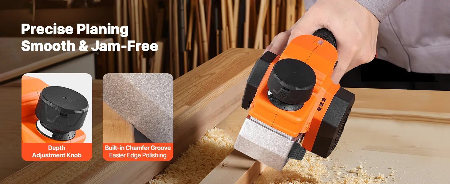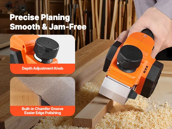This power handheld planer is equipped with an adjustable depth knob to easily adjust the planing depth. The built-in chamfer groove makes edge polishing easier and smooth planing without jamming, improving work efficiency and quality.