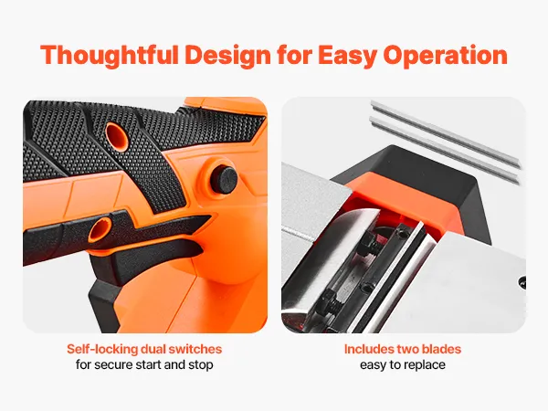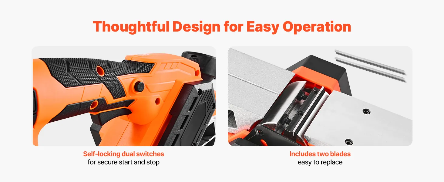 This electric wood planer comes with dual self-lock switches for a secure start and stop. It also includes two blades for simple replacement, making this operation faster and more convenient.