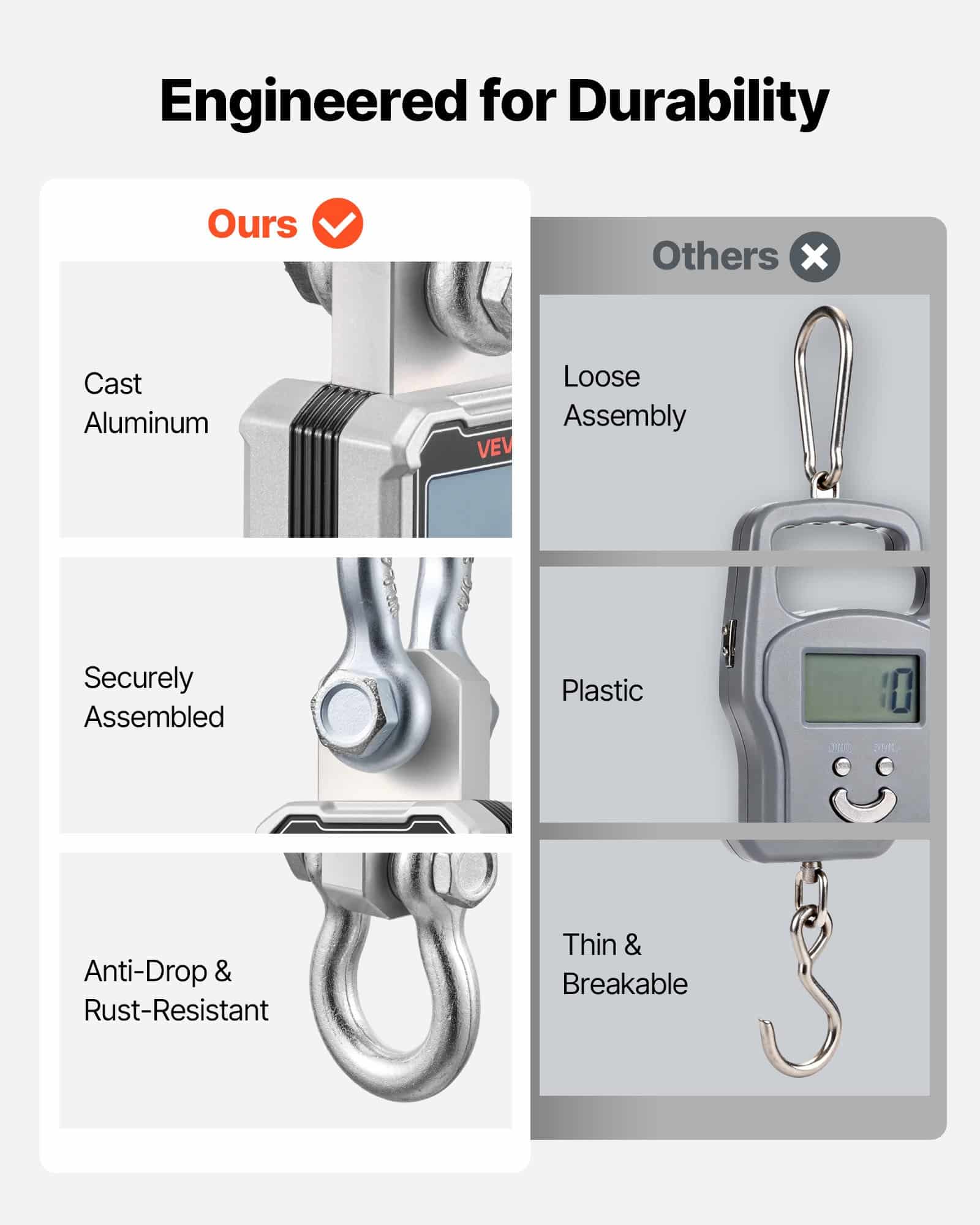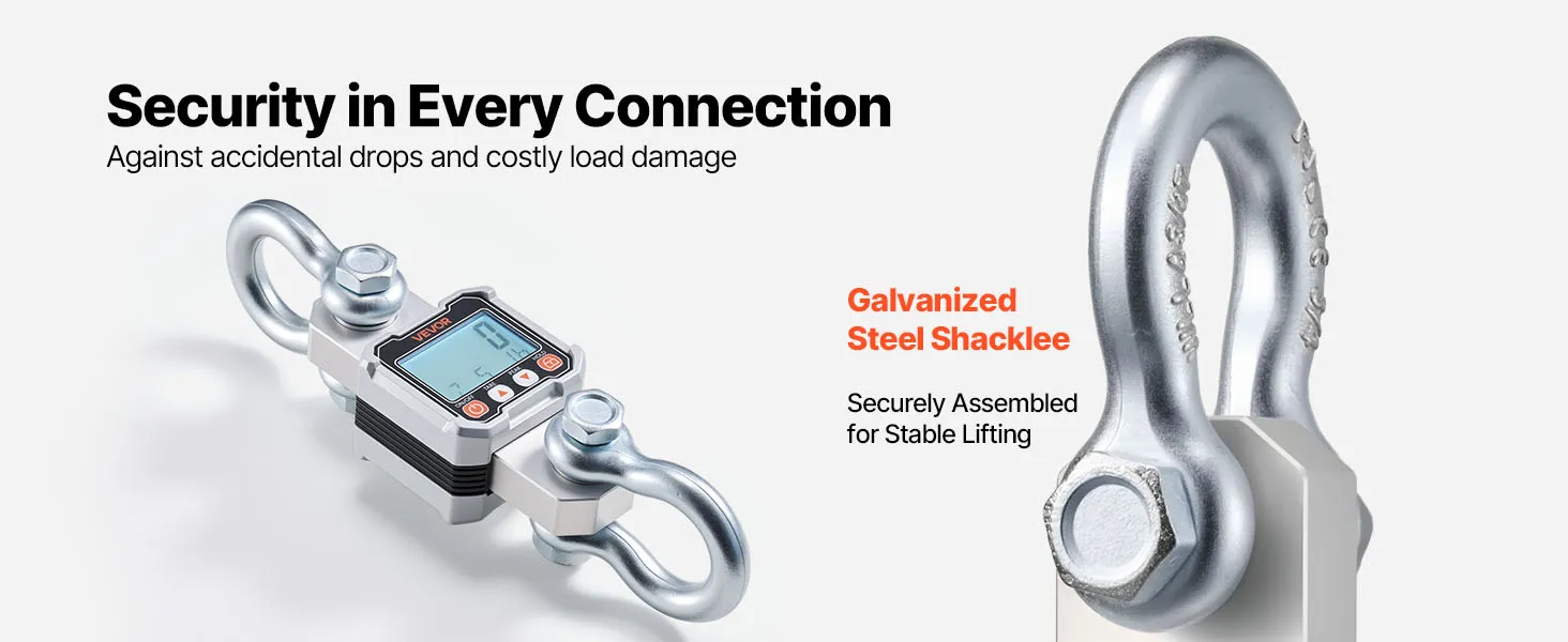 This industrial hanging scale adds a thick, zinc-plated steel shackle that’s firmly mounted to resist bending and rust. The solid structure helps avoid unhooking and keeps lifts steady and secure. Work with confidence!