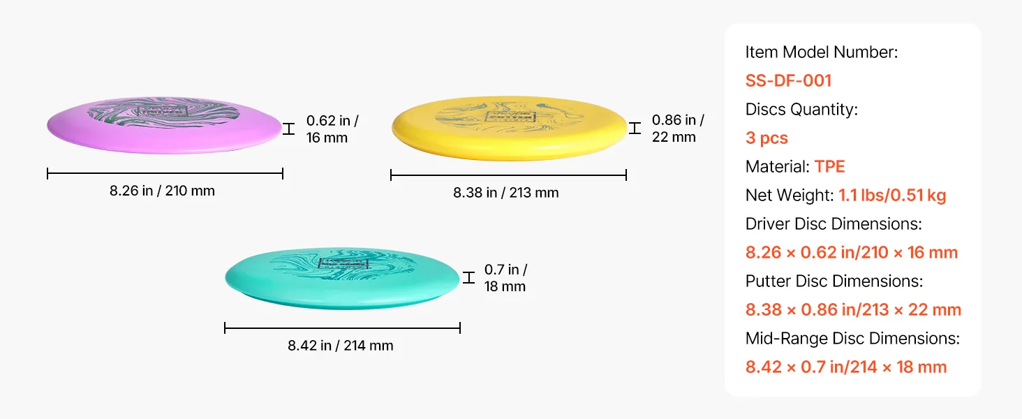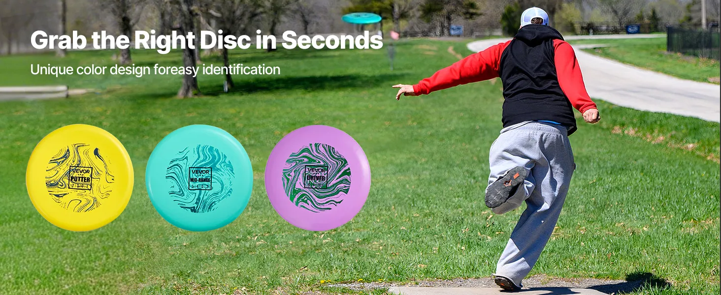 This disc golf starter set is made of durable TPE with great impact resistance. Ergonomic design supports upper-body training and core coordination. With printed guides, it's easy for beginners to get started and advanced players for growth. Compact and easy to carry for use in parks, lawns, beaches.