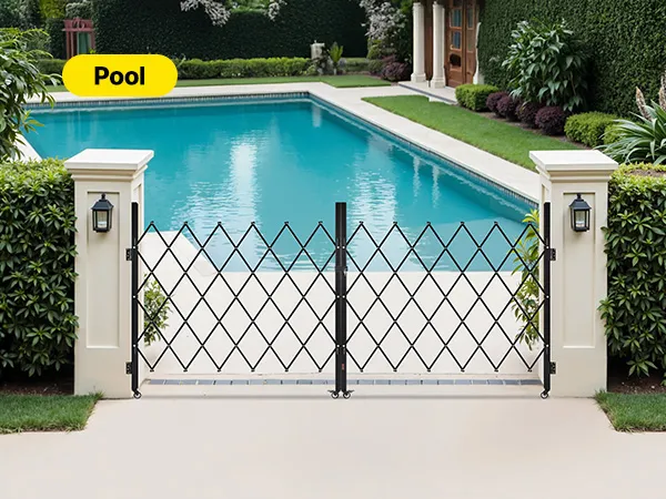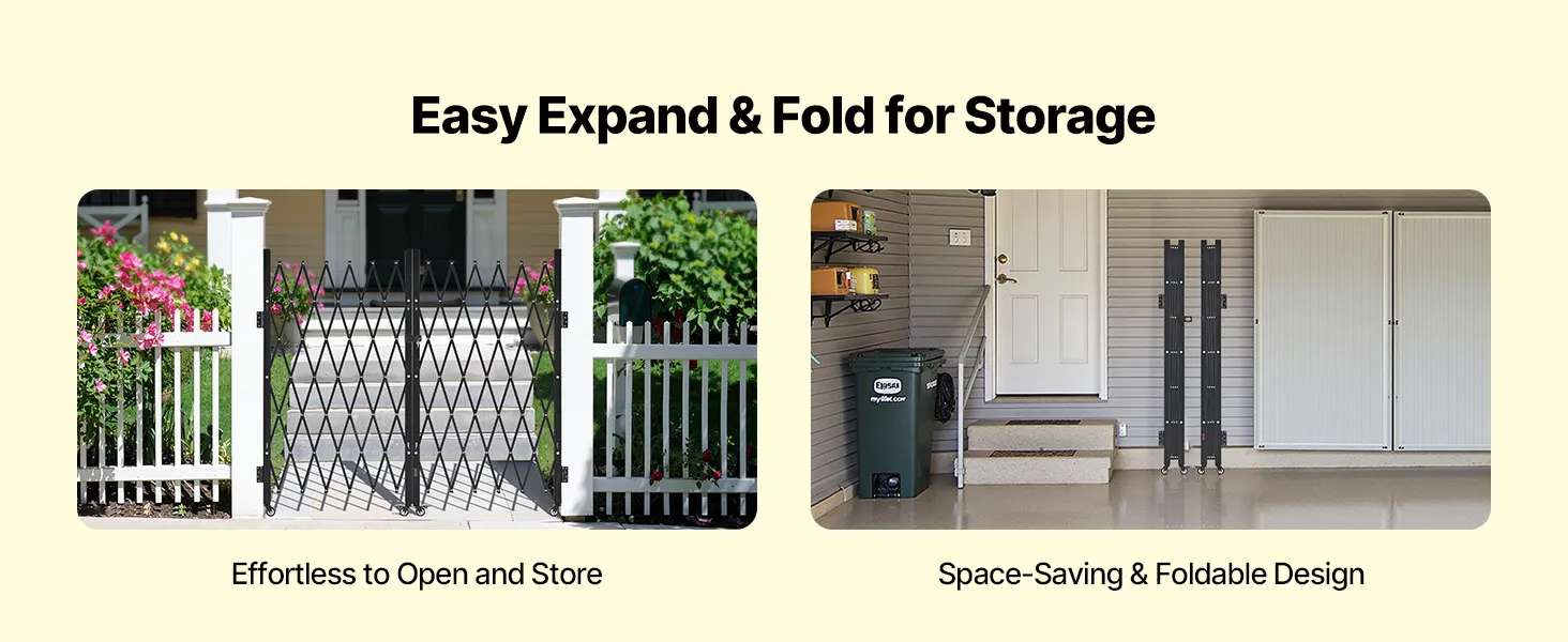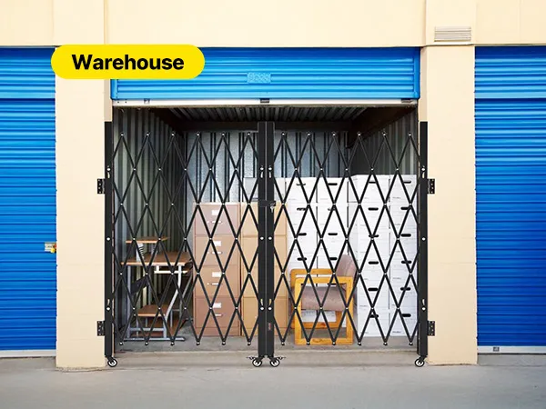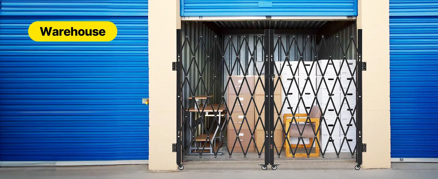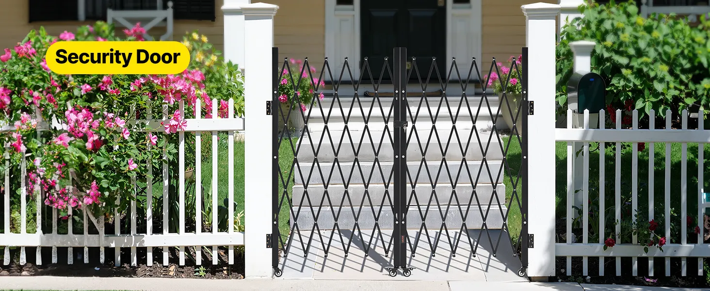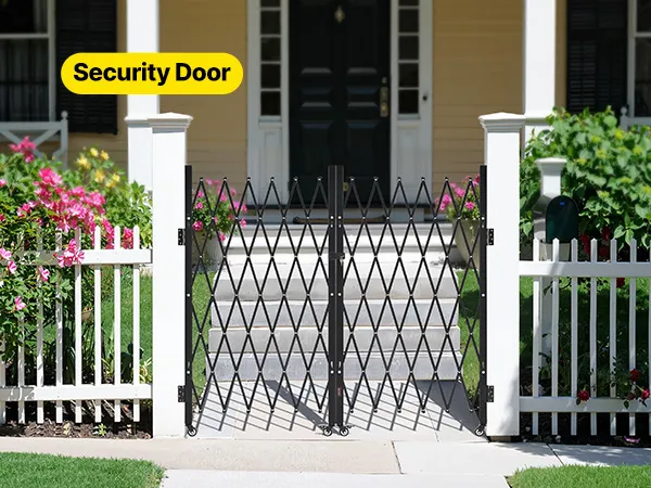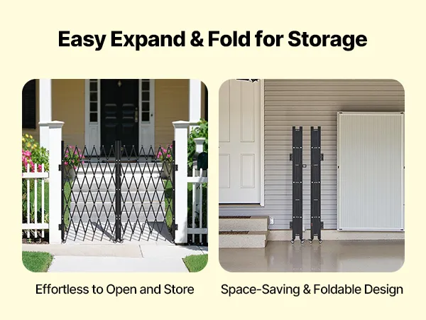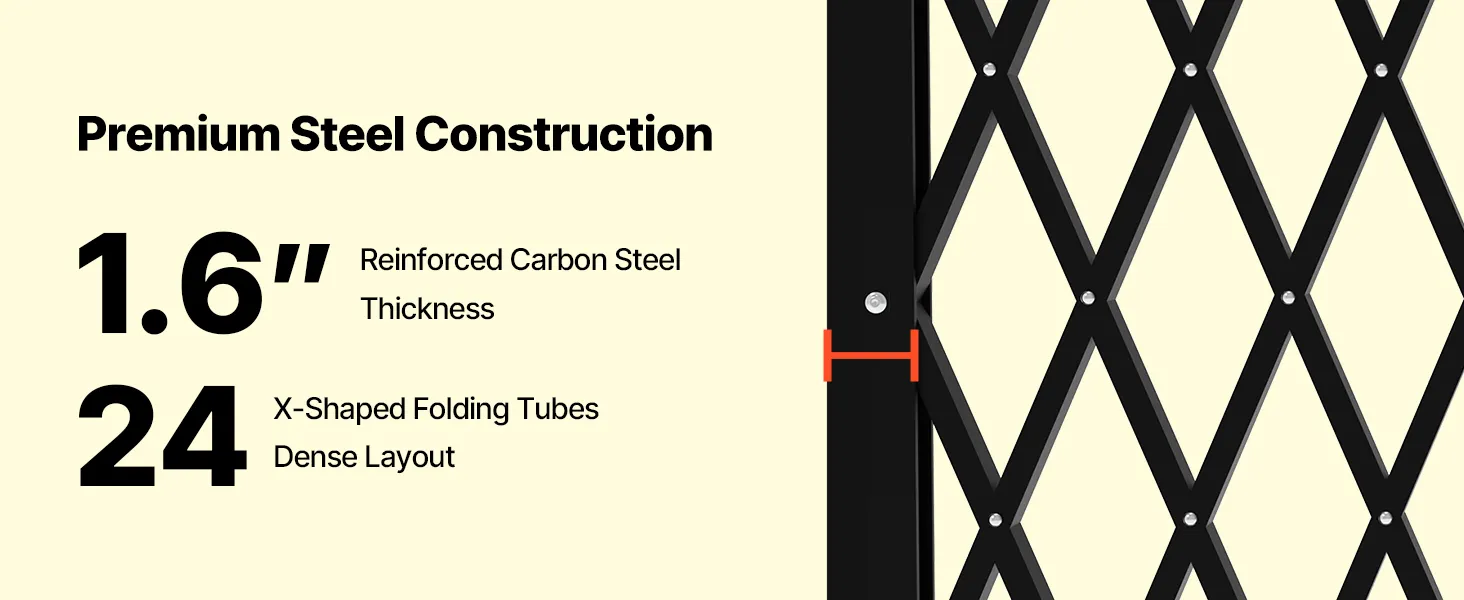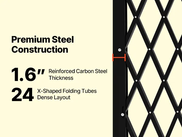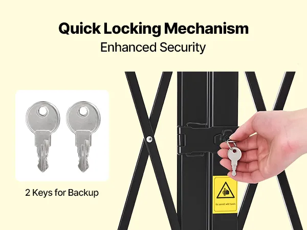 Our folding security gate is made of durable channel steel with a black powder coating for extended use. It features a lock for enhanced security and comes with an installation kit, making it ideal for busy hallways or entrances in commercial settings.