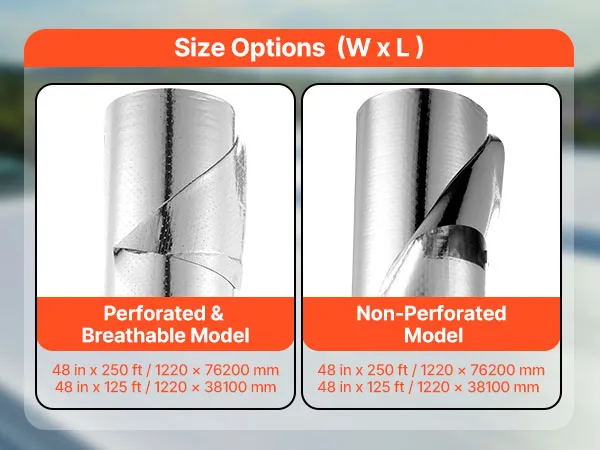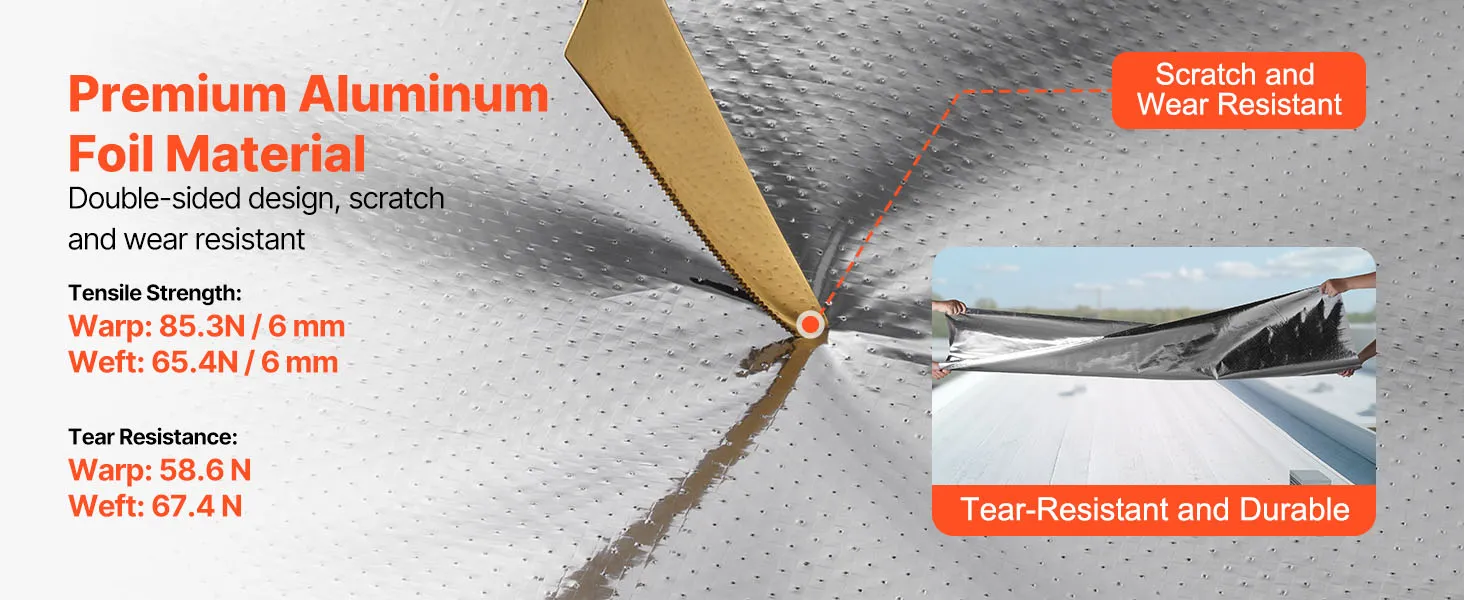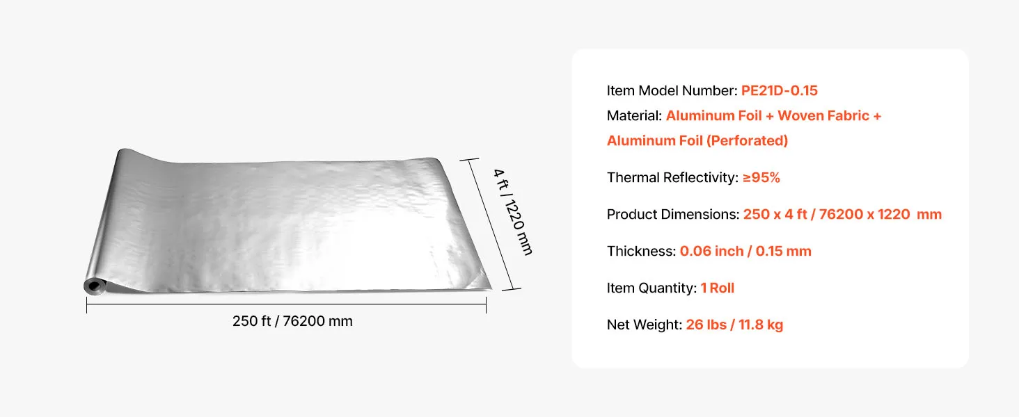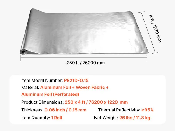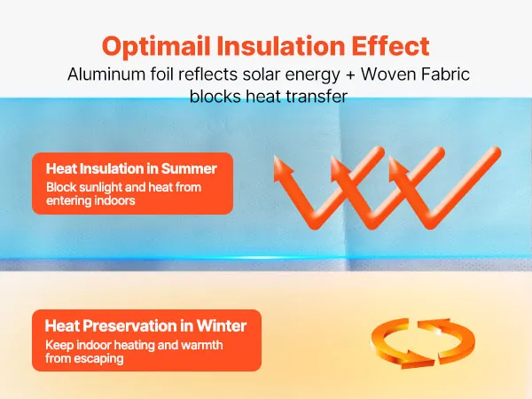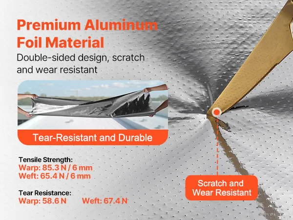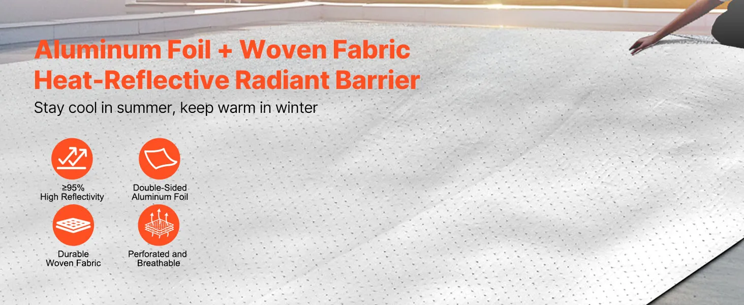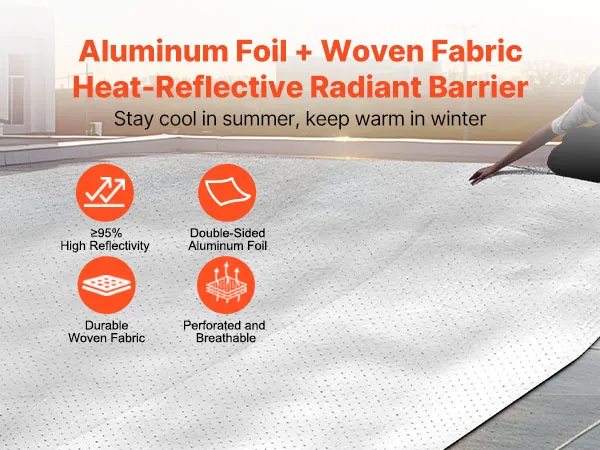 VEVOR double reflective insulation roll features ≥95% high reflectivity, utilizing double reflective aluminum foil and perforated woven fabric. It blocks sunlight in summer while preventing indoor heating loss in winter, maintaining a comfortable indoor temperature.
