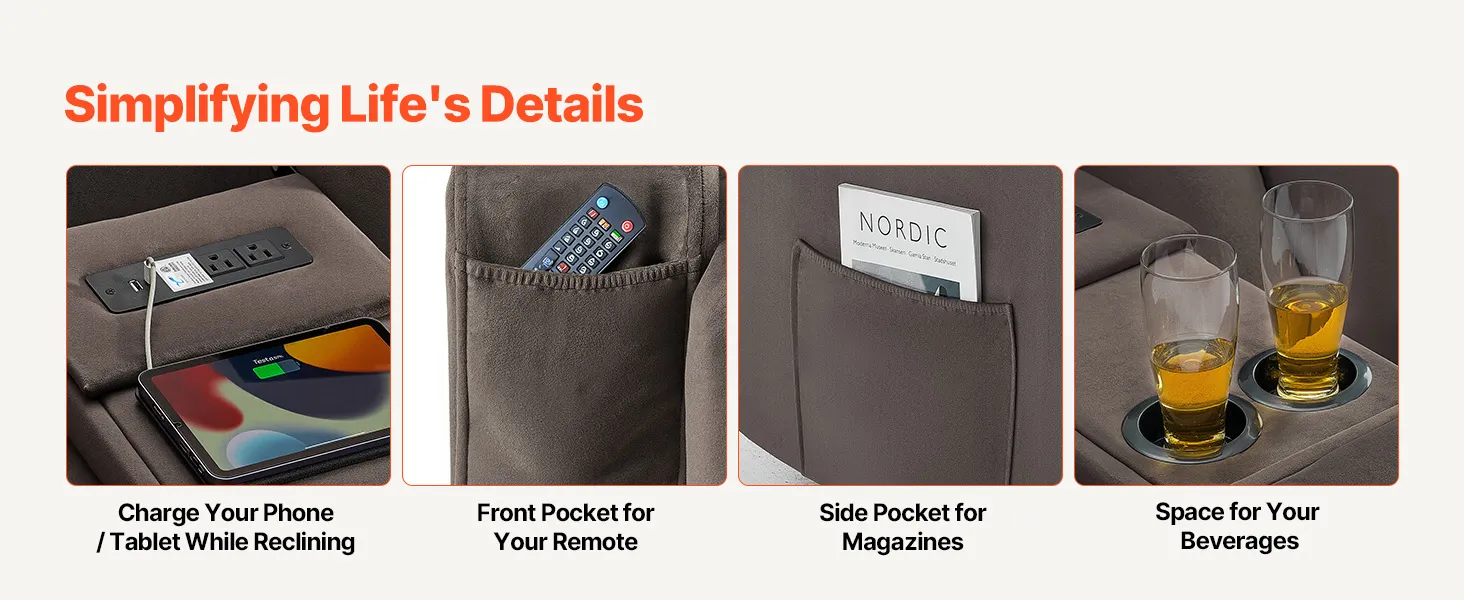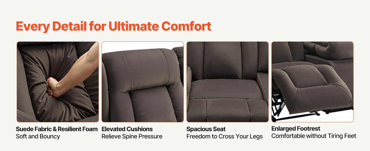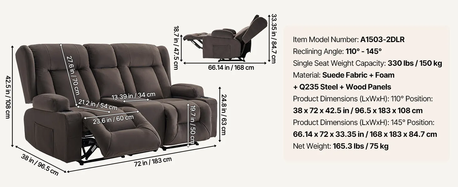 VEVOR Loveseat Recliner Sofa, Power Reclining Couch with Heating & Massage, Suede Electric Recliner Sofa with Center Console, USB Ports, Cup Holders & Side Bags, Dual Loveseat Chair for Living Room