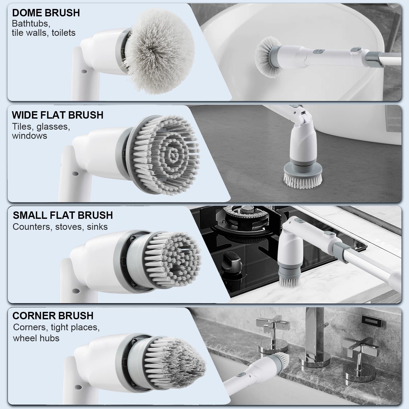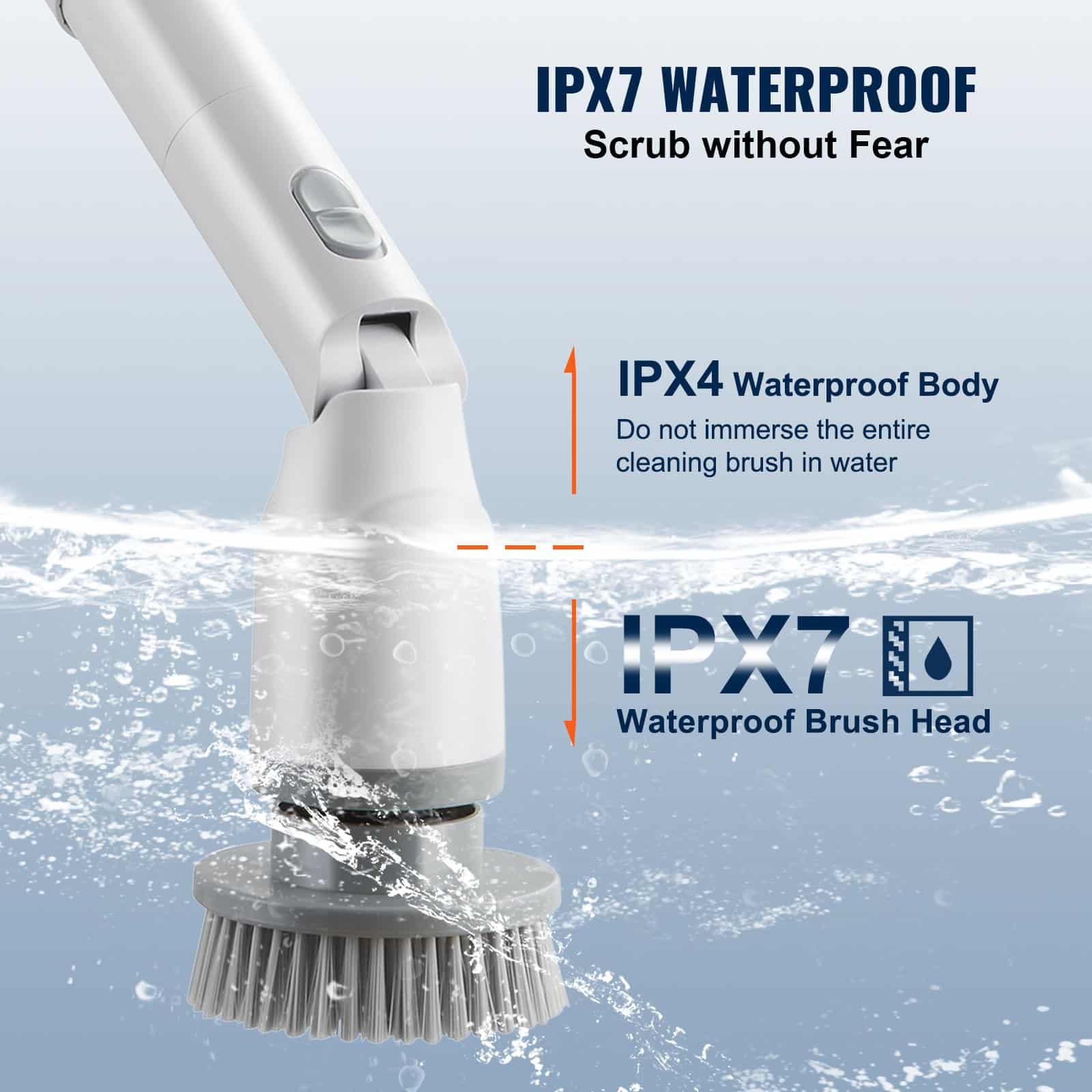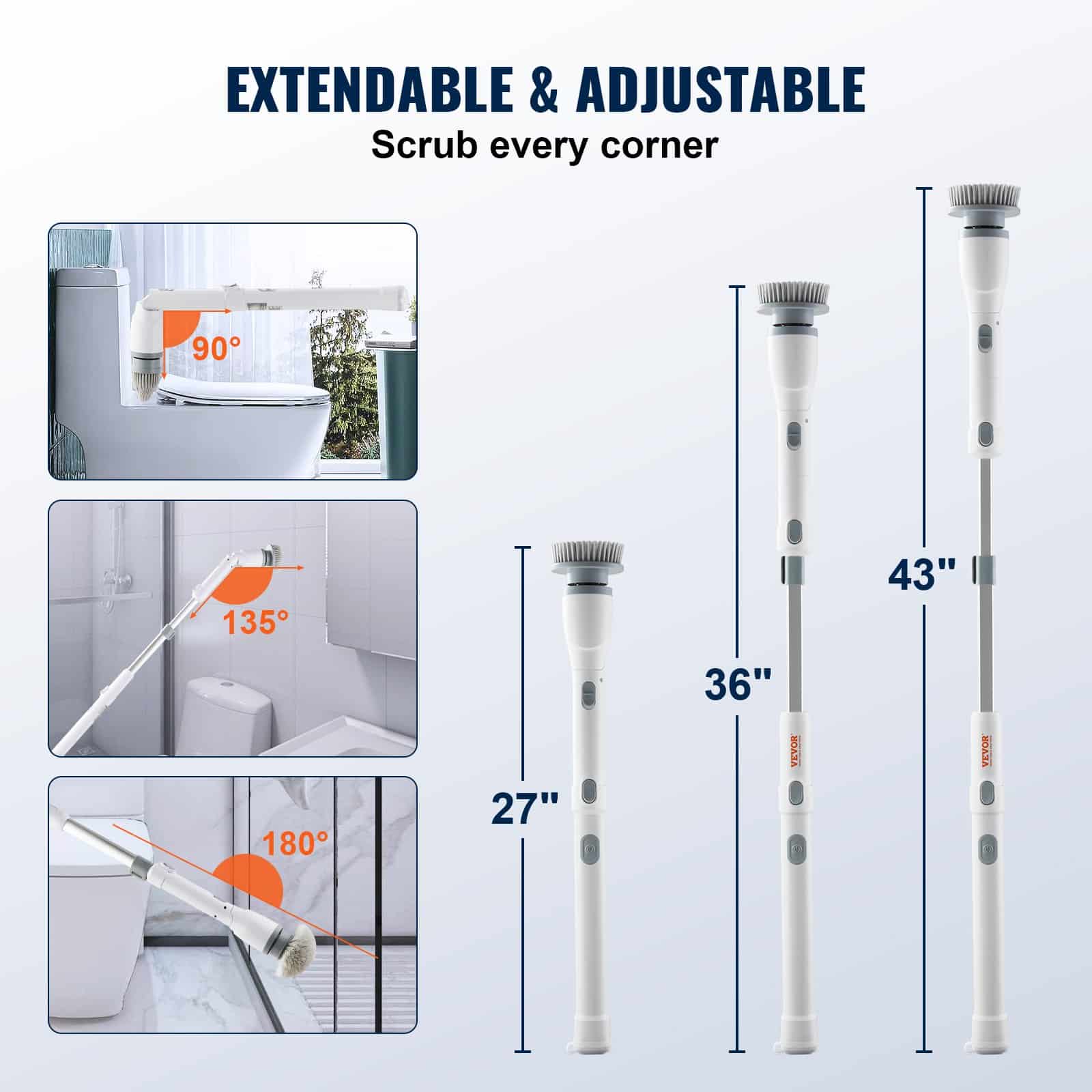 The electric scrubber's handle extends from 27 to 43 inches, enabling easy cleaning of hard-to-reach places without lifting or bending. With three adjustable brush head angles (90°, 135°, and 180°), you can choose the most comfortable and efficient cleaning position.