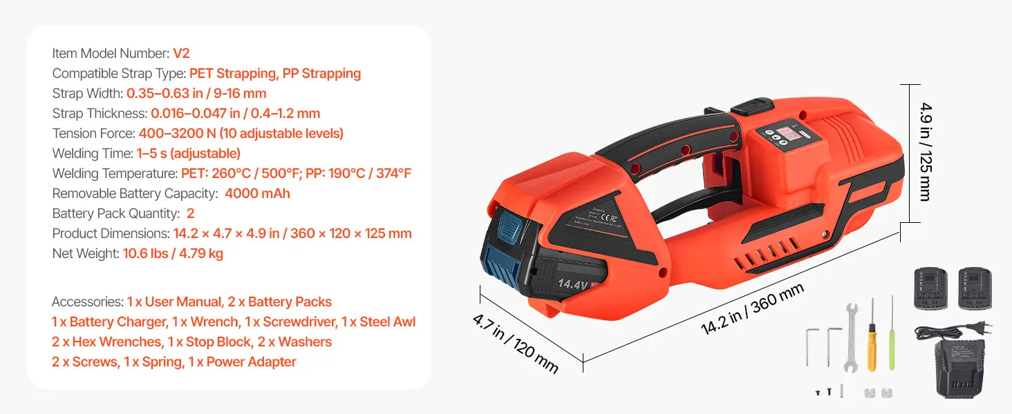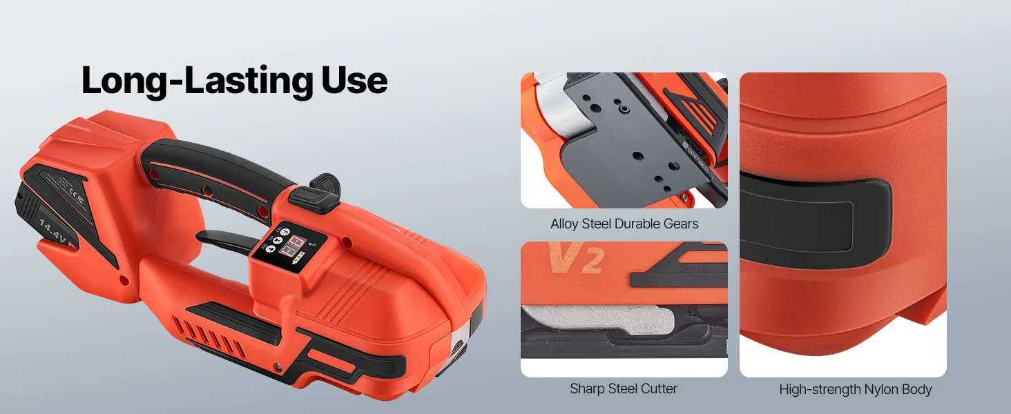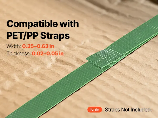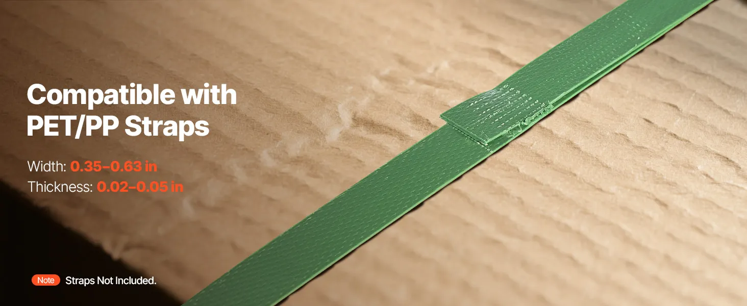 • Strong & Secure Seal: The built-in heating system of the automatic strapping tool provides 260℃ (PET) / 190℃ (PP) stable welding, fit for PET/PP straps (9-16 mm wide, 0.4–1.2 mm thick). You get a solid joint in seconds, no breaks, no slips
