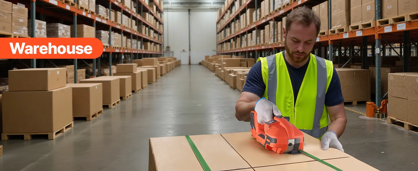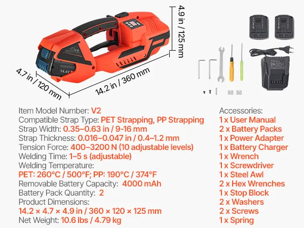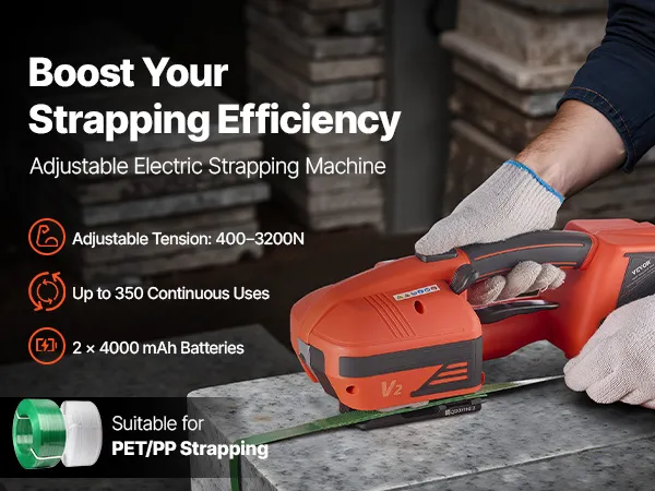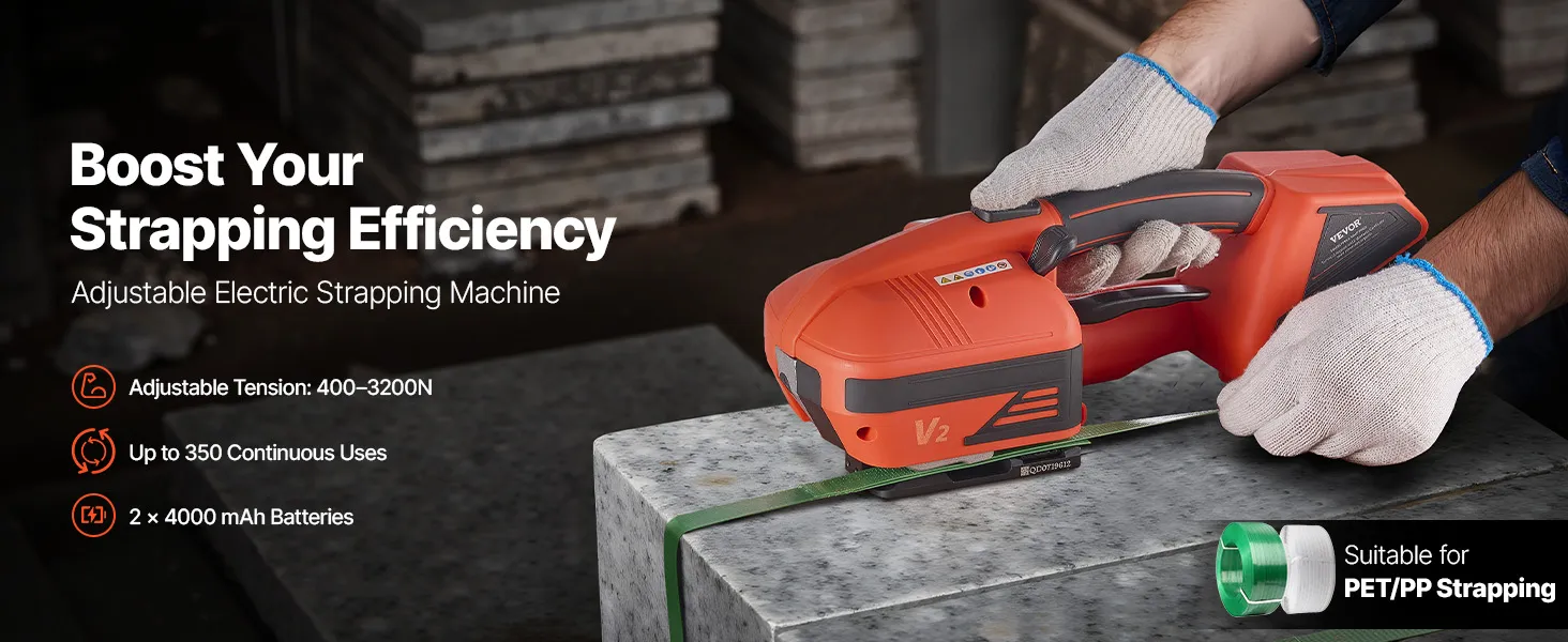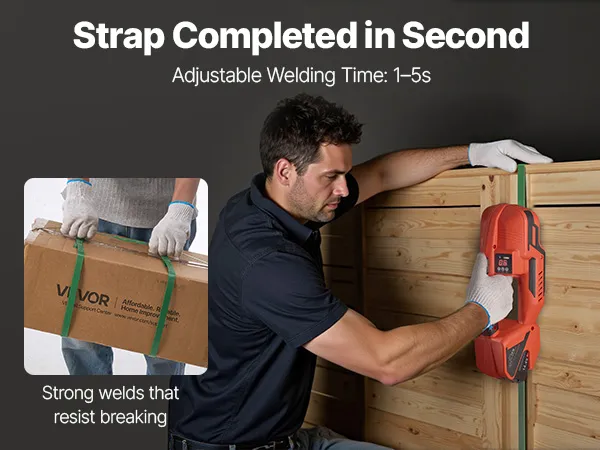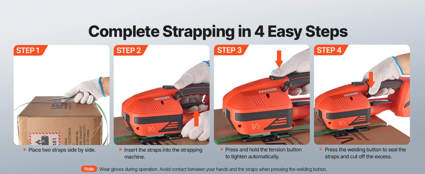 • Strong & Secure Seal: The built-in heating system of the automatic strapping tool provides 260℃ (PET) / 190℃ (PP) stable welding, fit for PET/PP straps (9-16 mm wide, 0.4–1.2 mm thick). You get a solid joint in seconds, no breaks, no slips