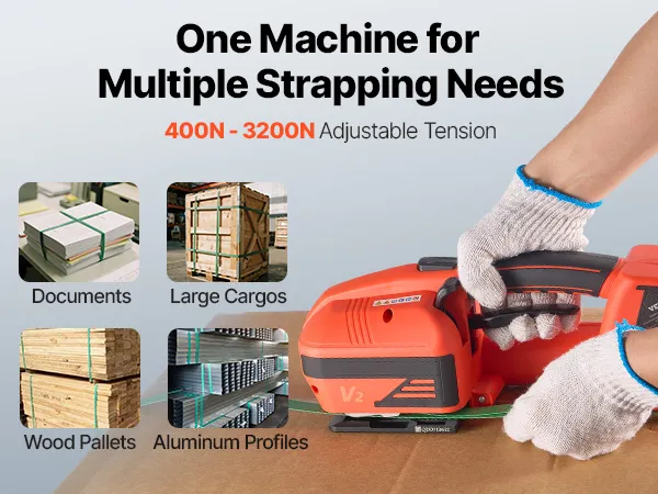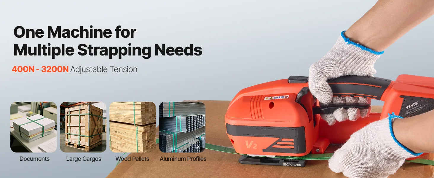 • Heavy-duty Strapping: This electric strapping machine delivers up to 3200N tension, easily securing pallets, stone, or steel rolls. With 10 adjustable levels (400–3200N), it also handles boxes, wood, and packages with ease