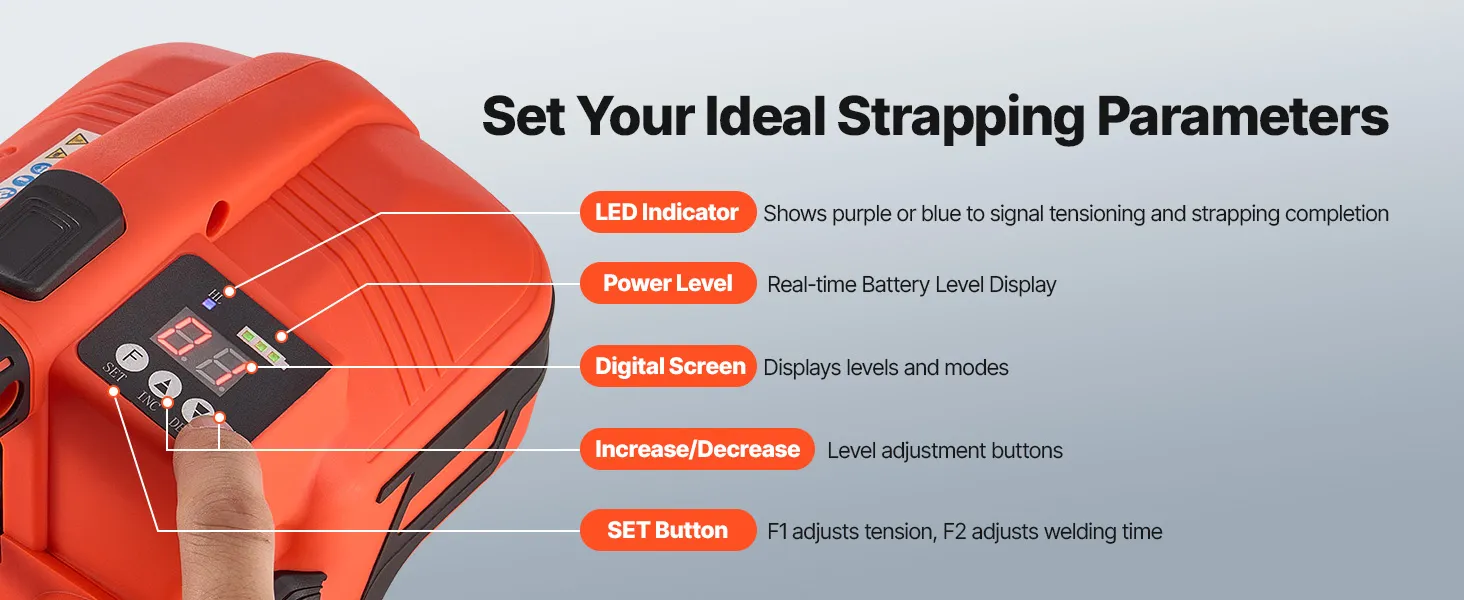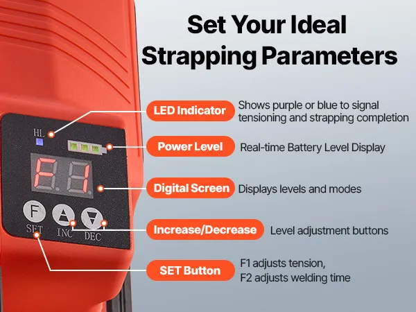 • Smart Digital Control: A clear digital panel of the strapping machine shows tension, time, and status in real time. The 3-button design makes it super easy to adjust settings for different loads, so strapping is always precise