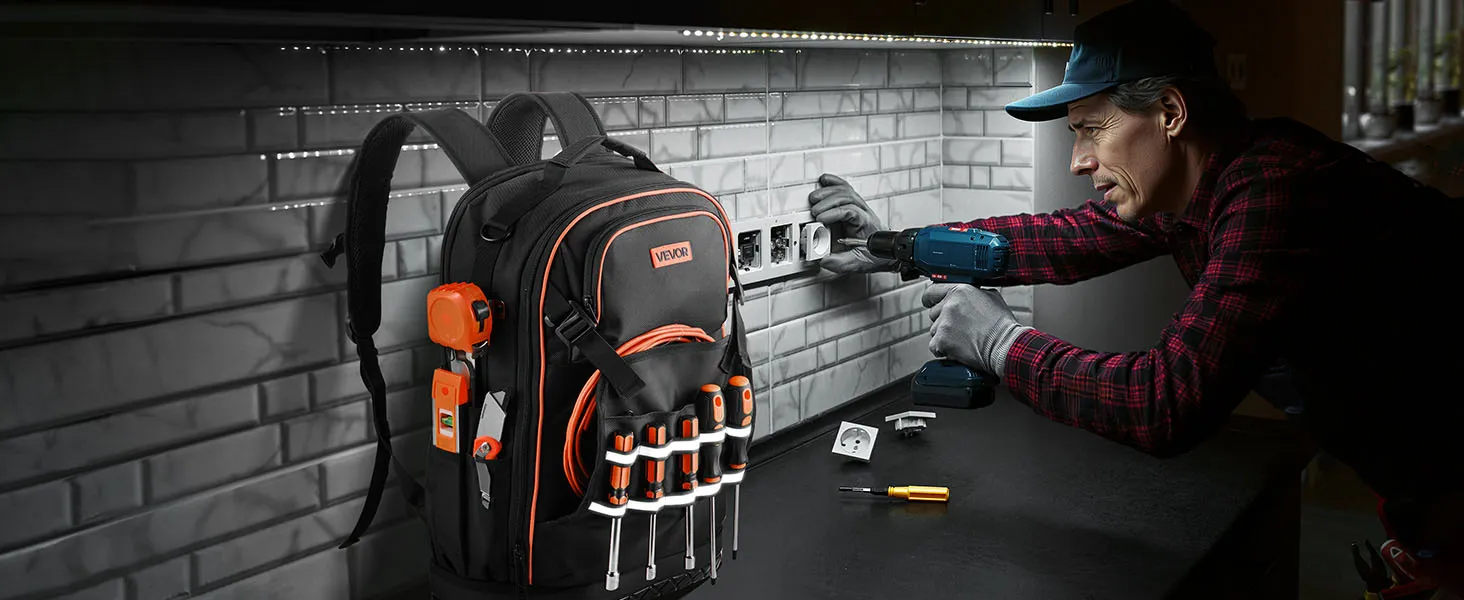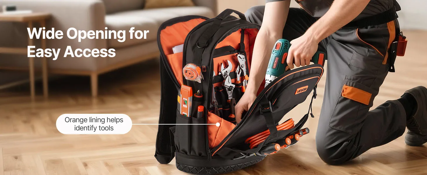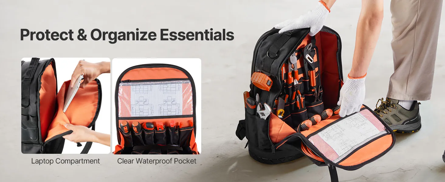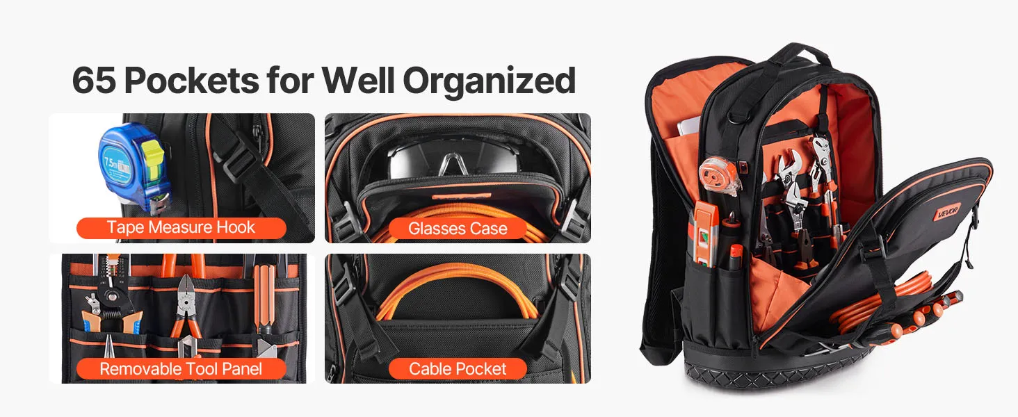 VEVOR Tool Backpack, 65 Pockets, Heavy-duty Tools Storage Organizer Work Bags with Laptop Compartment & Molded Base, Electrician Jobsite Backpack for Electrician, Repairman, and HVAC Techs