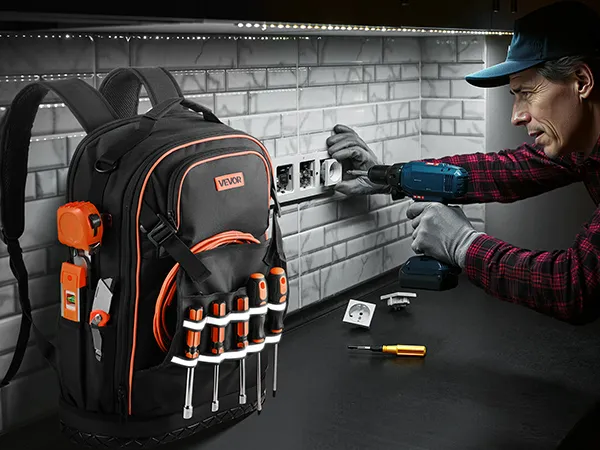 Этот рюкзак с 65 карманами и крючком для рулетки помогает разместить инструменты любых размеров. В нем даже есть отделение для ноутбука и прозрачный мешочек для хранения ценных вещей, что делает его идеальным переносчиком инструментов!