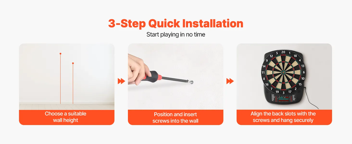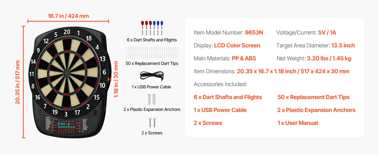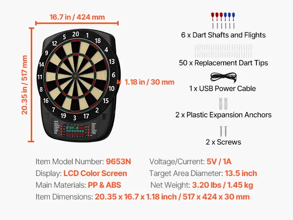 Includes 6 dart shafts and flights, 50 replacement dart tips, 1 USB power cable, 2 plastic expansion anchors, 2 screws, and a user manual. No professional tools needed—install in minutes and start playing right away.