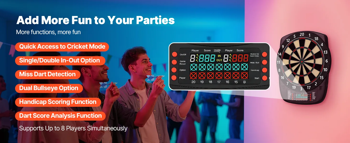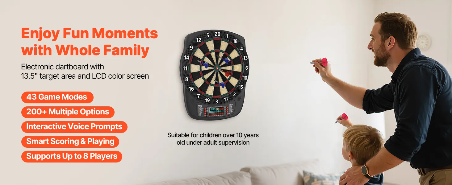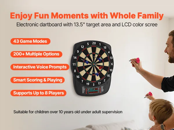 This electronic dartboard comes with 43 game modes and 200+ gameplay combinations, supporting up to 8 players simultaneously. LCD color screen shows real-time scores and round progress, with multiple built-in functions to make every throw more accurate and engaging. Great for home and party fun.