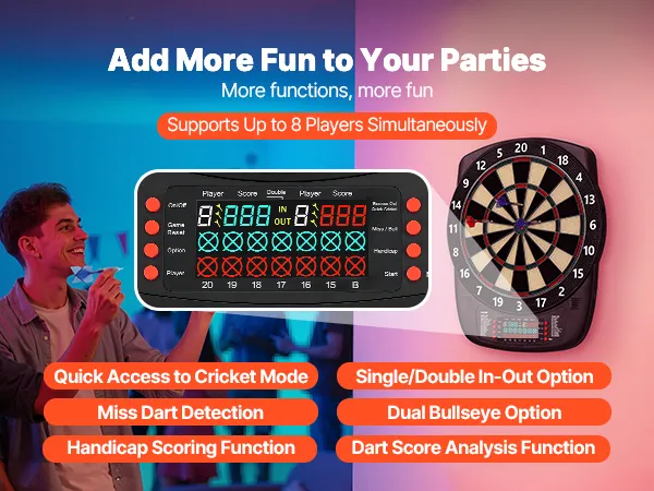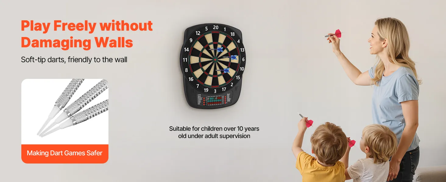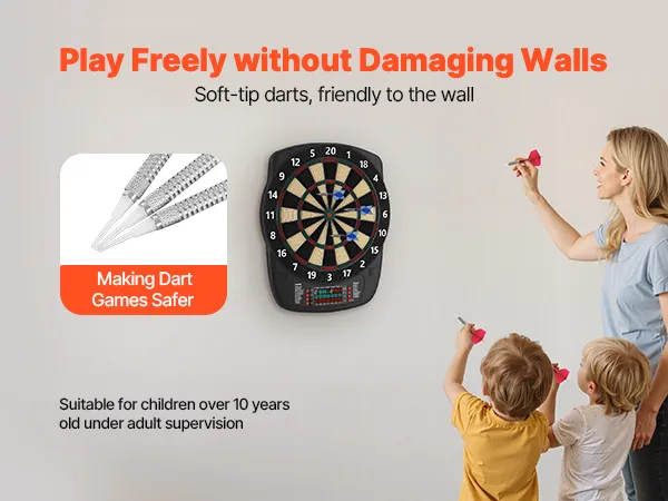 The electronic dart board includes soft dart tips that minimize scratches and impacts, protecting your walls from damages. It delivers a fun-filled and interactive gaming experience at home, parties, or in game rooms.
