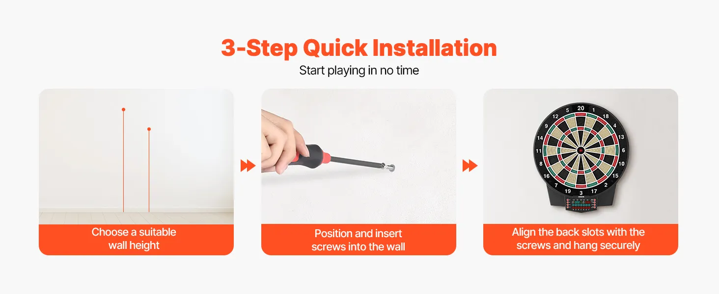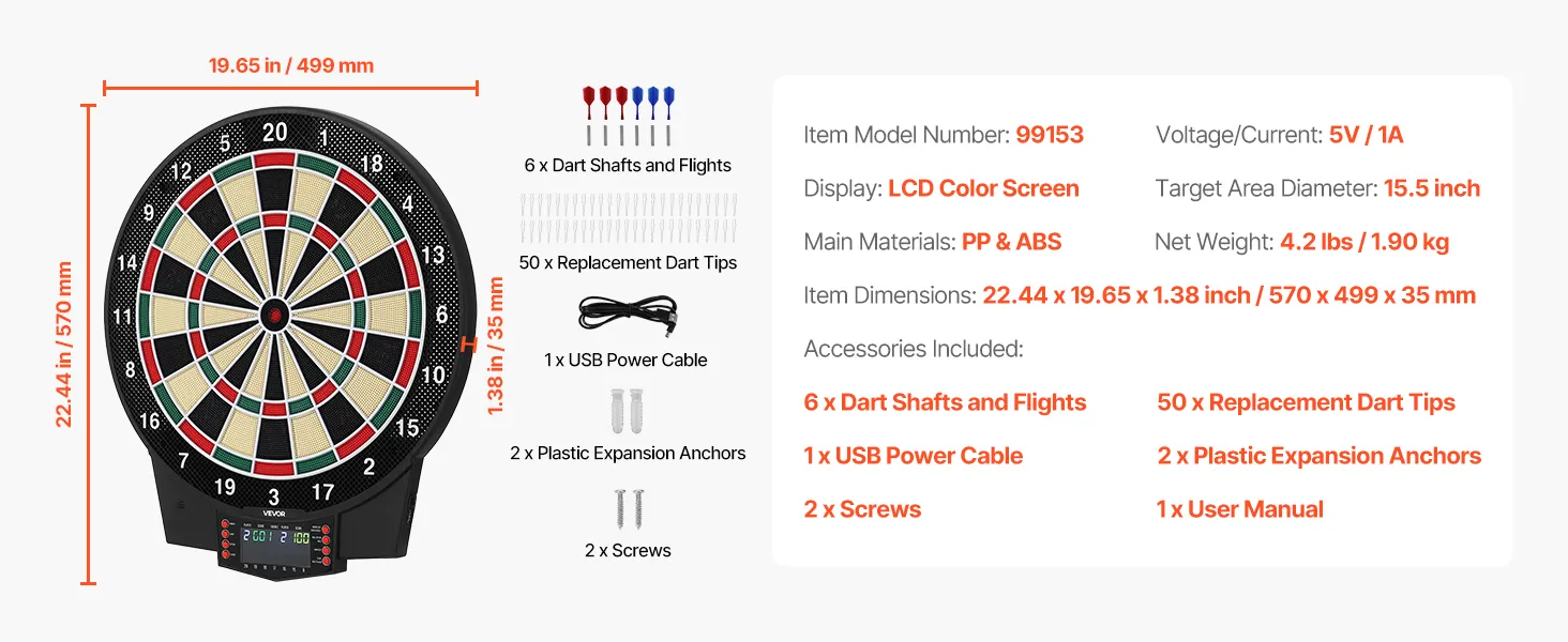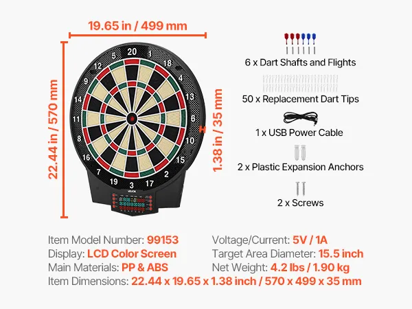 Includes 6 dart shafts and flights, 50 replacement dart tips, 1 USB power cable, 2 plastic expansion anchors, 2 screws, and a user manual. No professional tools needed—install in minutes and start playing right away.